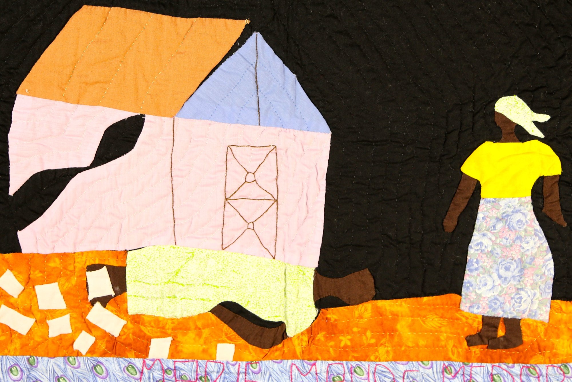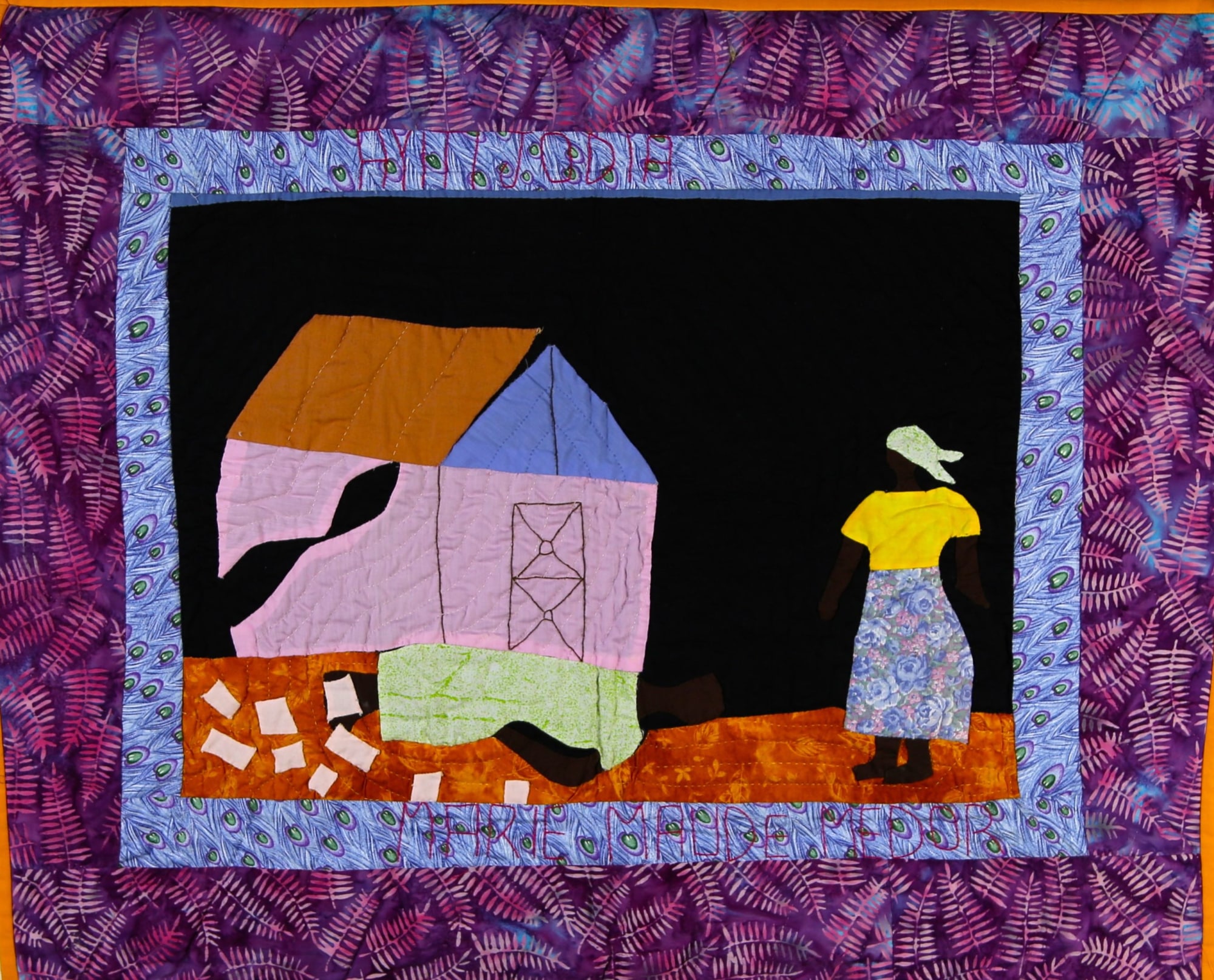 A blackened sky symbolizes the tragedy of Haiti's vulnerability to the devastation of an earthquake. Artist Marie Maude captures the scene as a means to tell the story of her experience confronting loss and sadness.