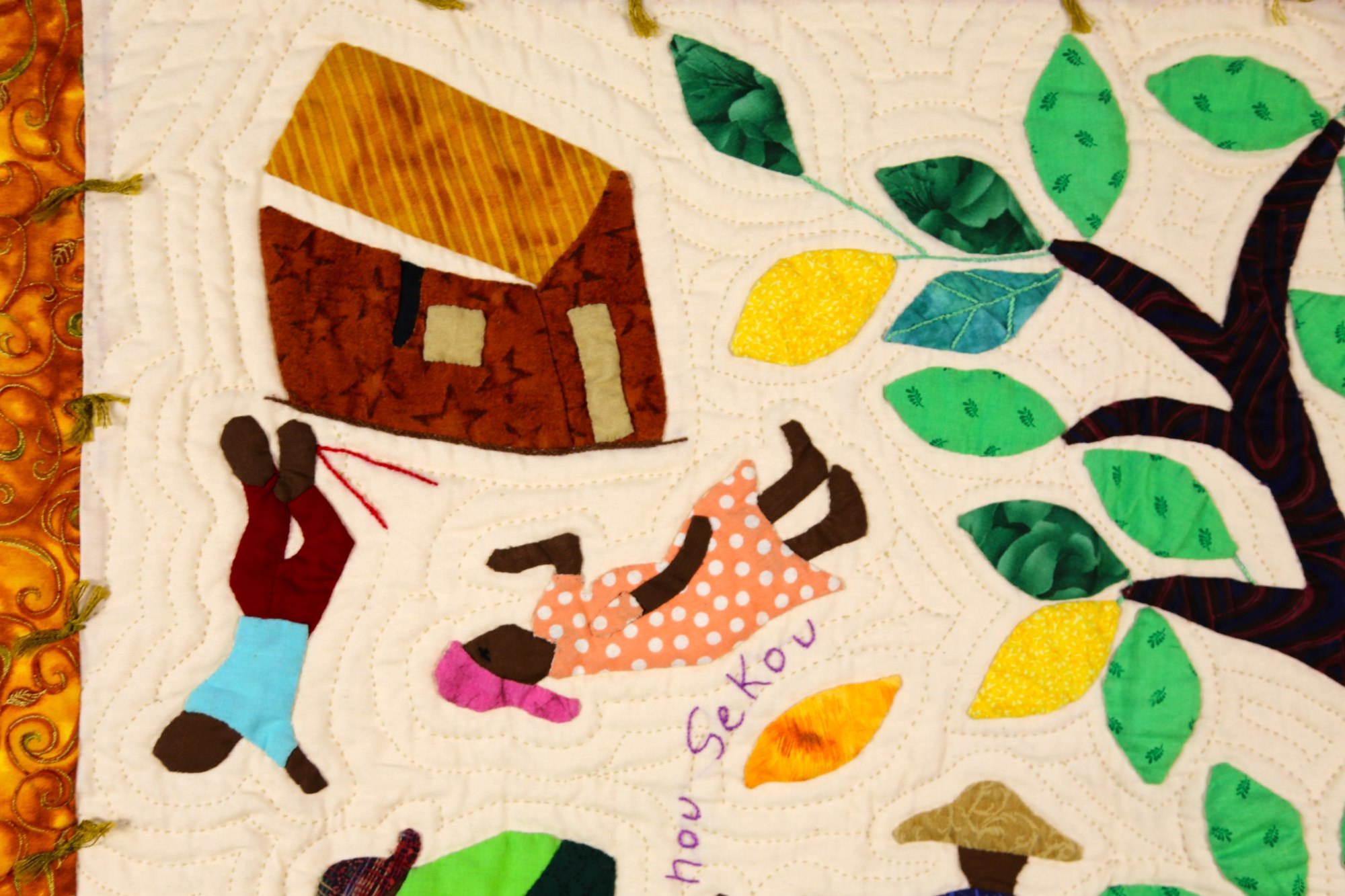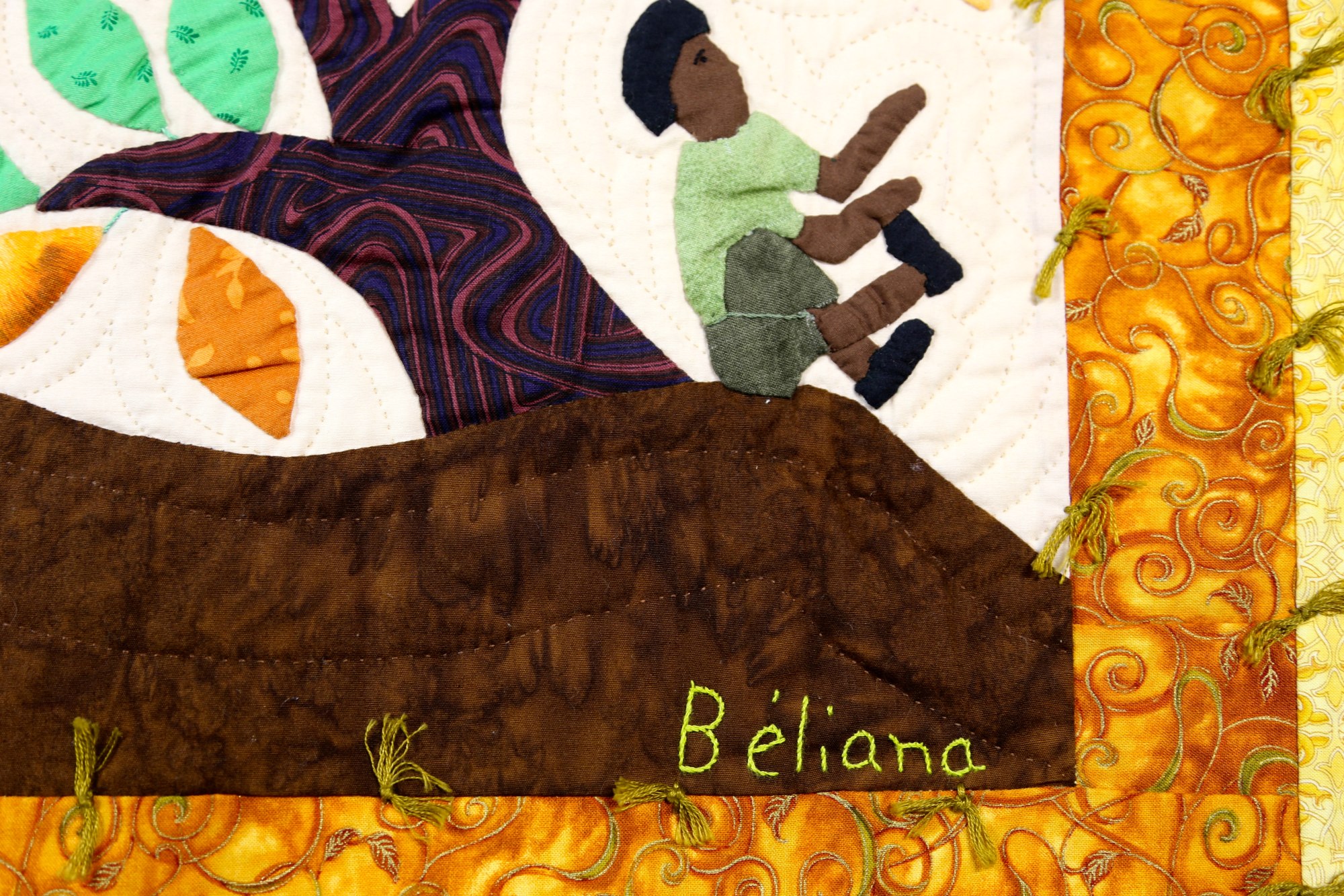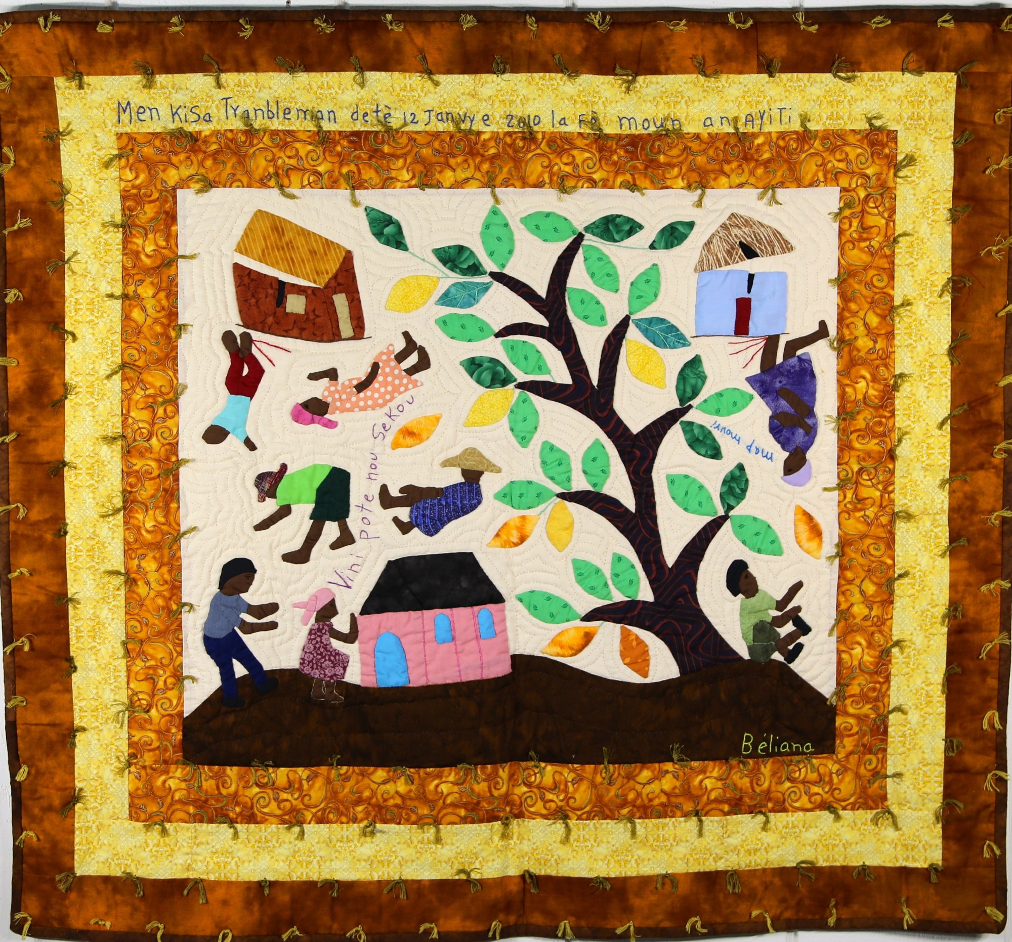 Following the devastating earthquake of 2010, the artists began making quilts showing what they had experienced as a means to process the trauma of that life-changing event. In this quilt by artist Beliana Maxime, she shows the destruction and human toll that had taken place all around her. Buildings are damaged and injured people crying out for help.