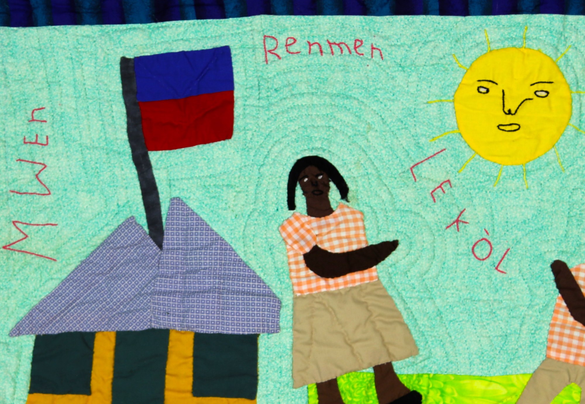 While education is highly valued in Haiti, many children's parents cannot afford to send them. Earnings from the sale of quilts mean that all the artists are able to educate their children. This quilt celebrates the joy of learning which can create a brighter future.