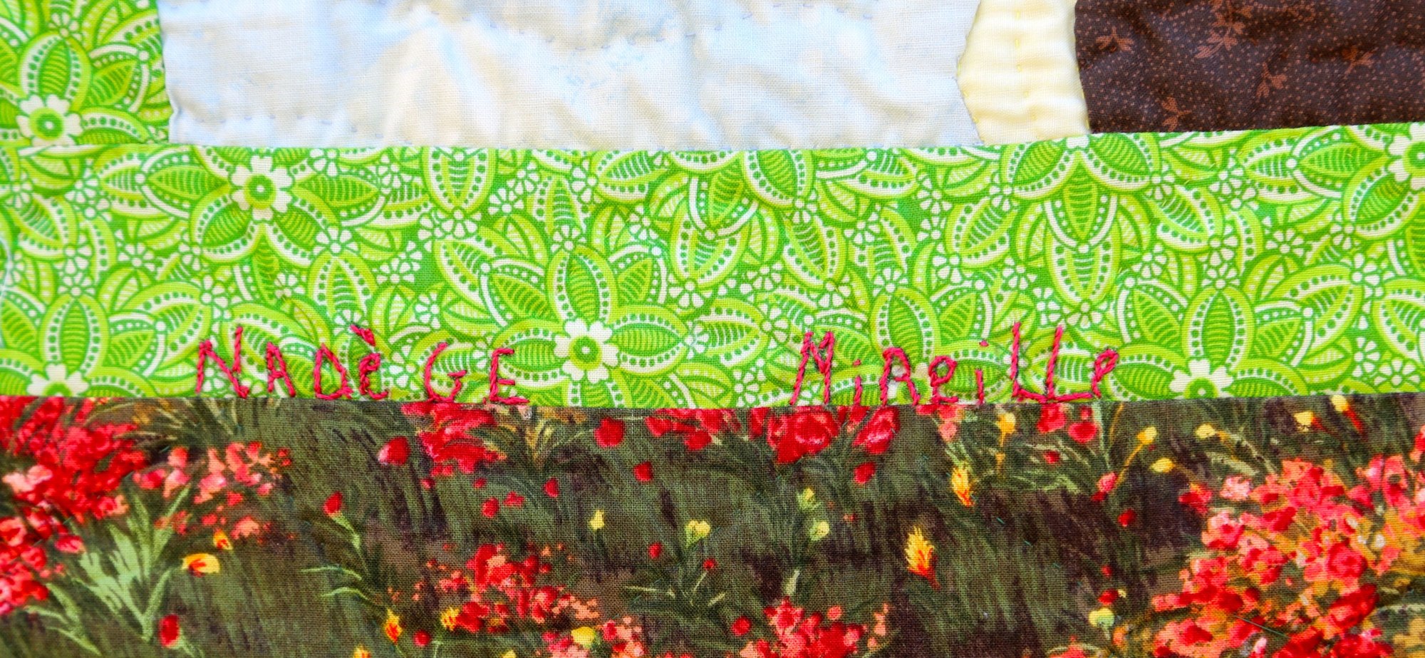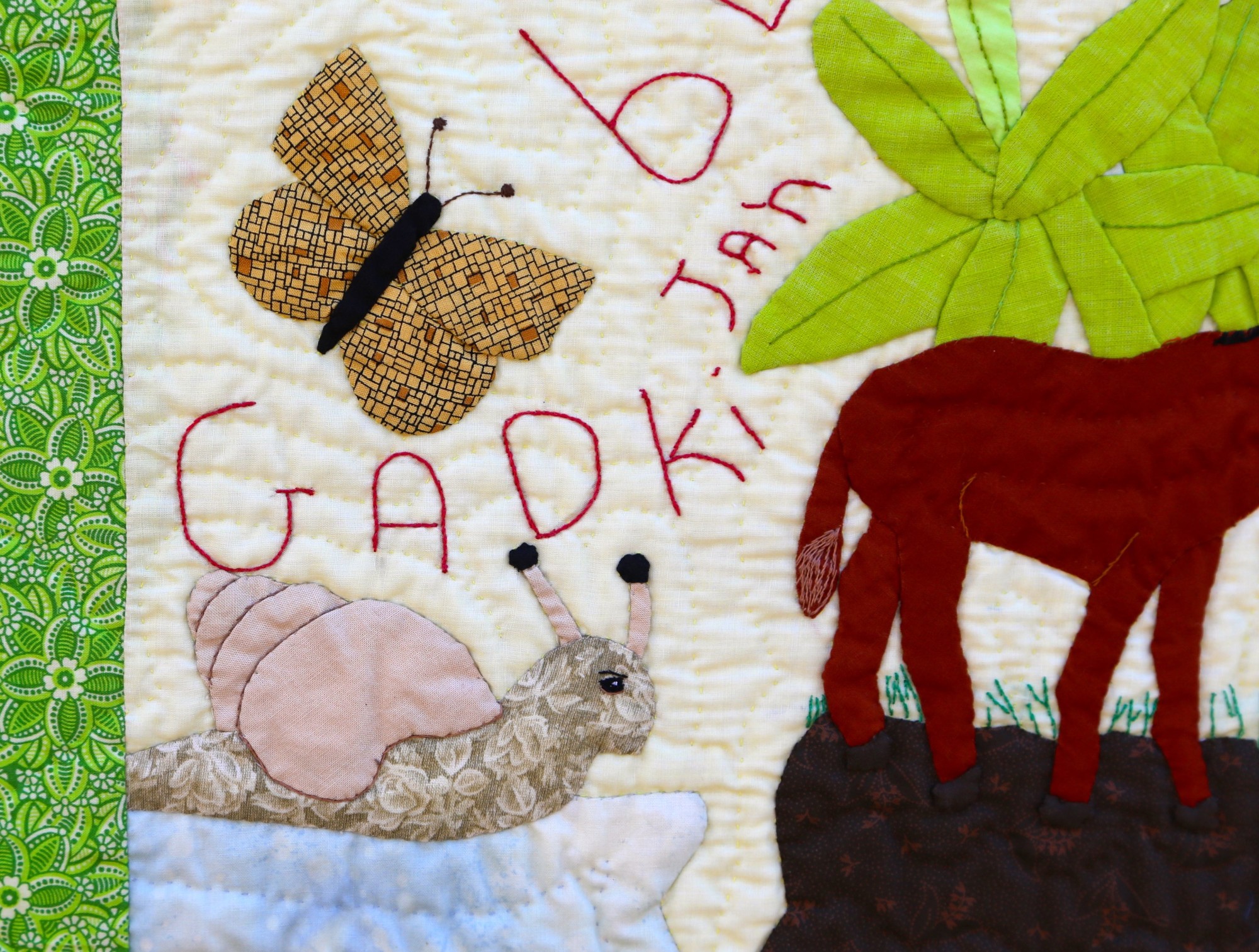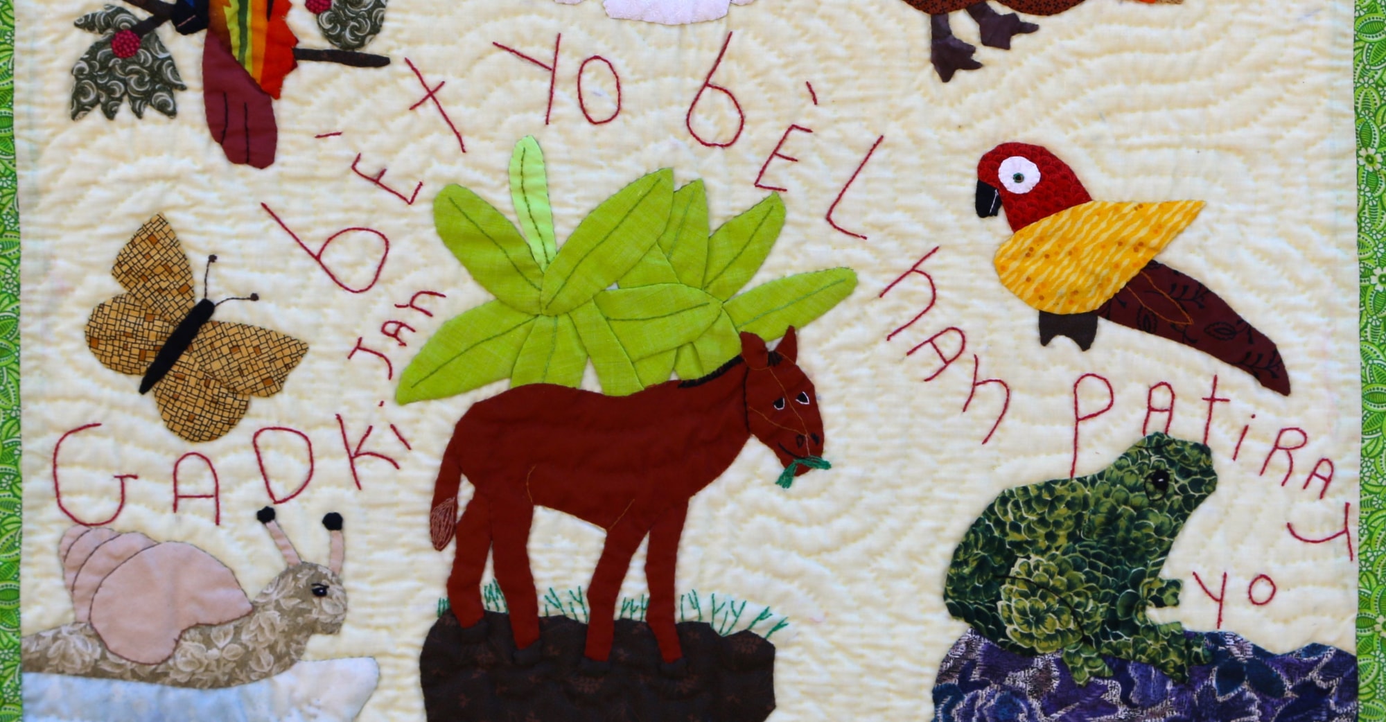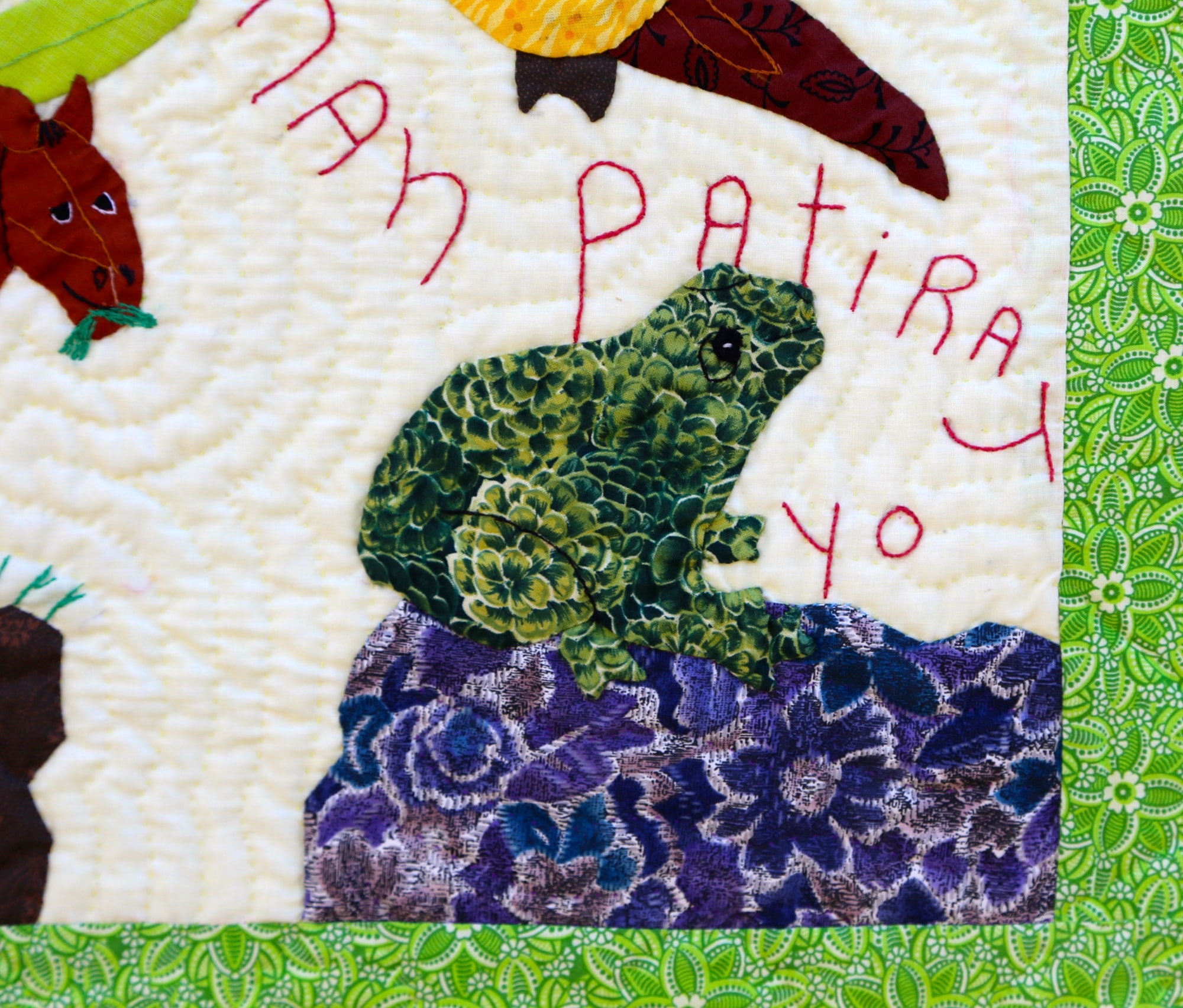 Hand appliquéd, quilted and embroidered on pieced cottons. Sleeve on reverse for hanging. Complementary copy of Patience To Raise the Sun included with your purchase.