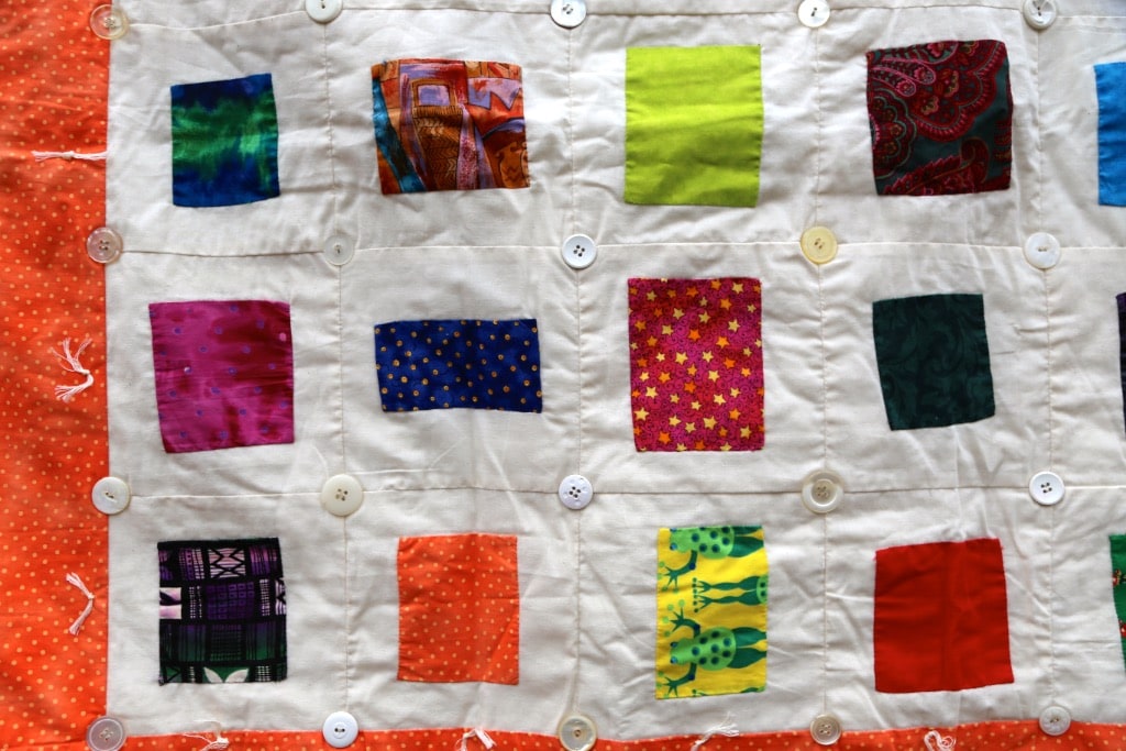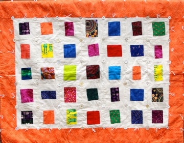 Go bold or go home! Add a graphic pop to any space. Can be used as a throw quilt or hung on a wall (sleeve on reverse). 100% cotton pieces and scraps are upcycled and treadle-machine pieced. Hand 'knotted' using the traditional method. Complementary copy of Patience To Raise the Sun included with your purchase.