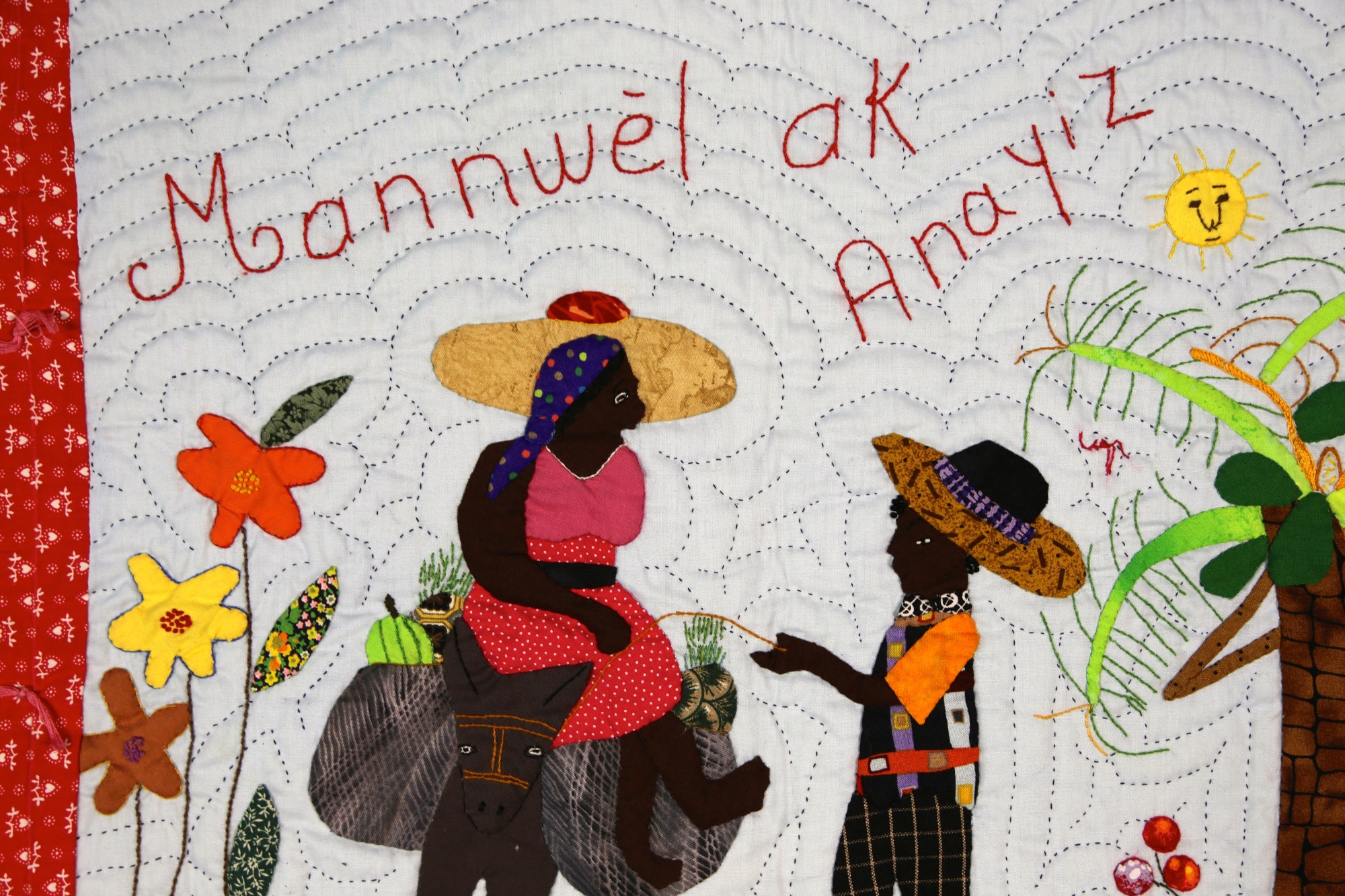 The donkey is loaded up to bring fresh produce to market. A typical scene of Haitian country life includes trees, flowers and the sun shining down from the sky.