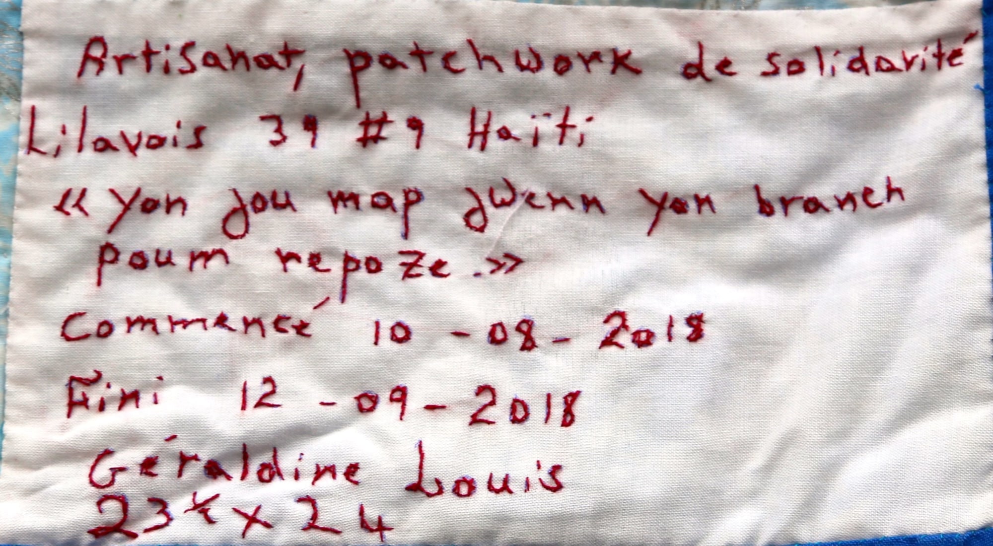 100% cotton. Hand-appliquéd, quilted and embroidered throughout. Sleeve on reverse for hanging. Complementary copy of Patience To Raise the Sun included with purchase.