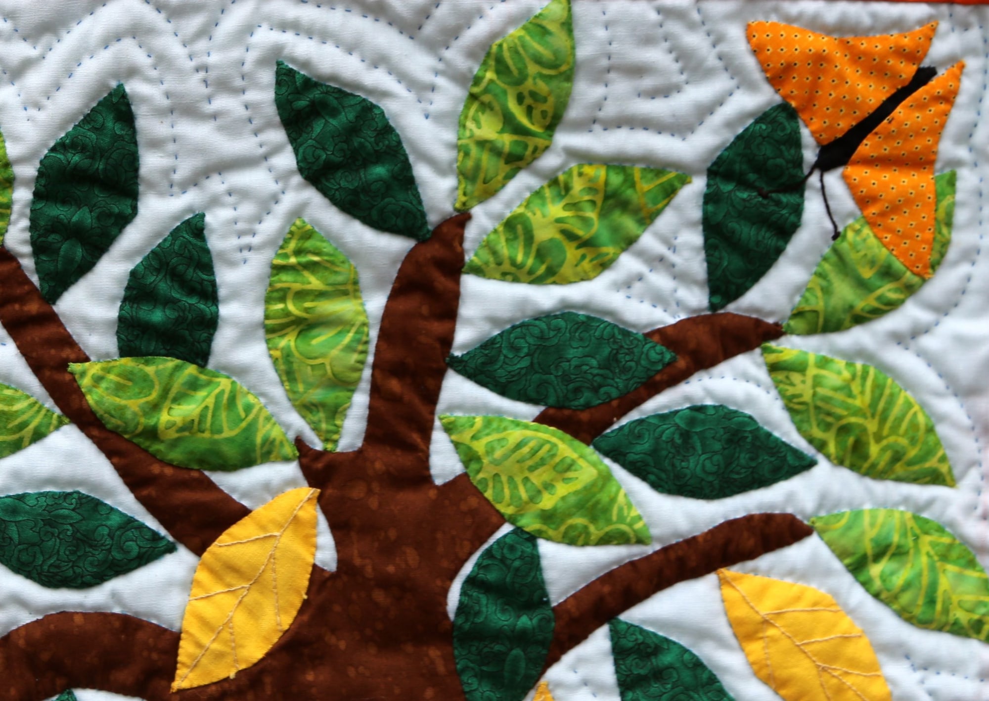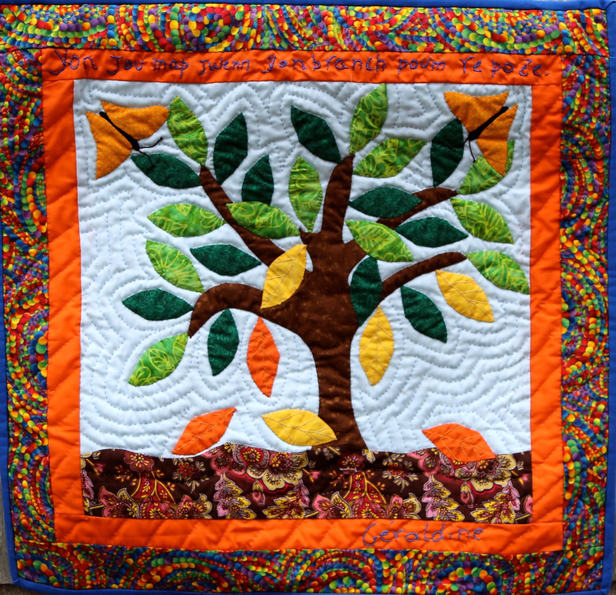 100% cotton. Hand-appliquéd, quilted and embroidered throughout. Sleeve on reverse for hanging. Complementary copy of Patience To Raise the Sun included with purchase.