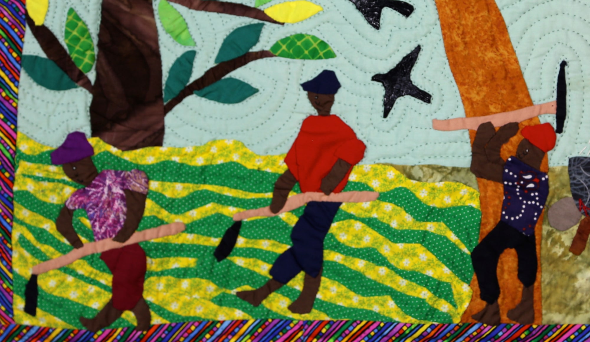 Life in Haiti can be difficult but the work continues! A typical scene of country life is depicted in great detail - tilling the fields, toting water, cooking in the outdoor pot, birds flitting through the treetops. Treadle-machine pieced, hand quilted, appliquéd and embroidered of 100% cotton by artist Marielle Lorge. 26x28.5 inches. Purchase includes a copy of exhibition catalogue Patience to Raise the Sun.