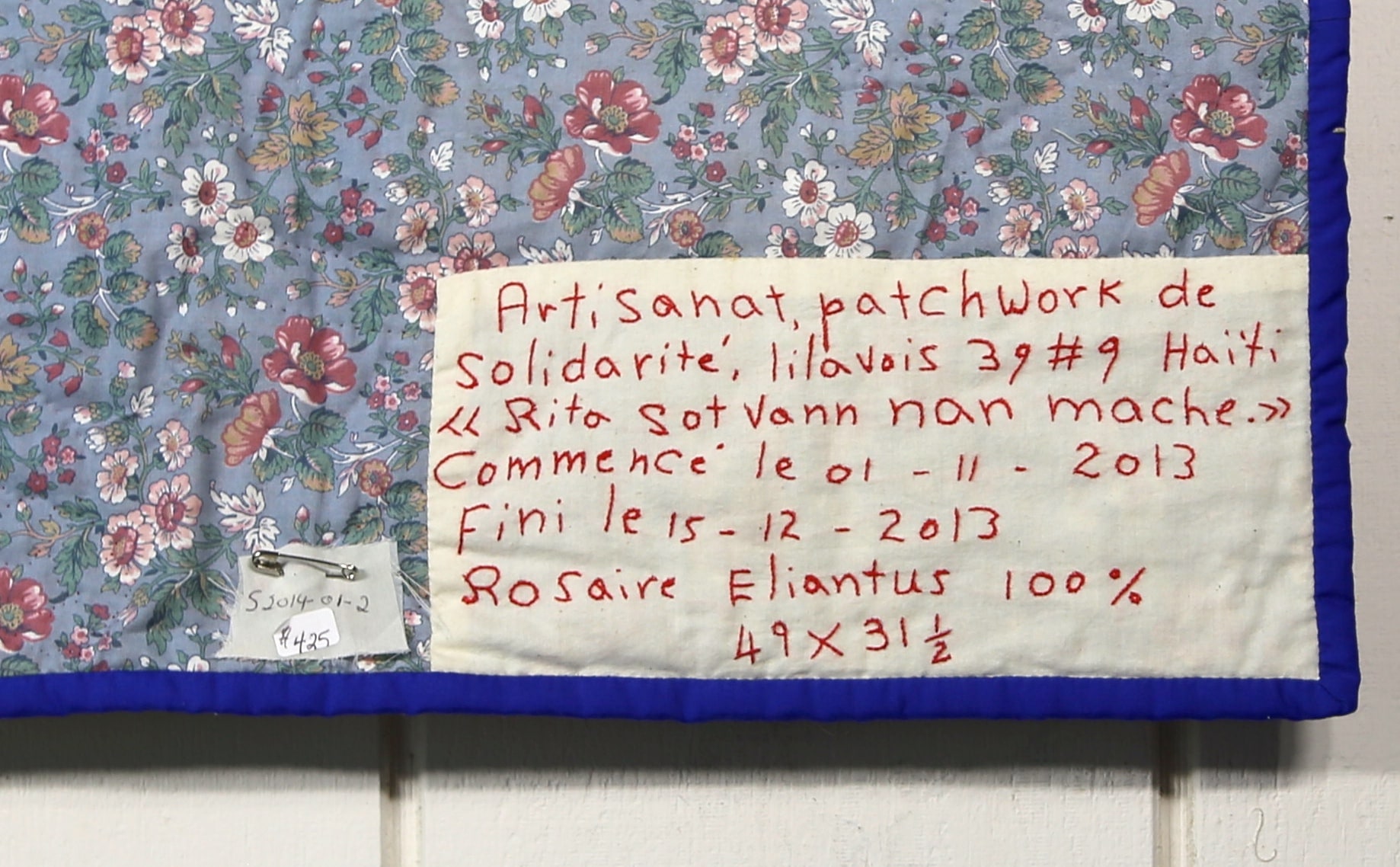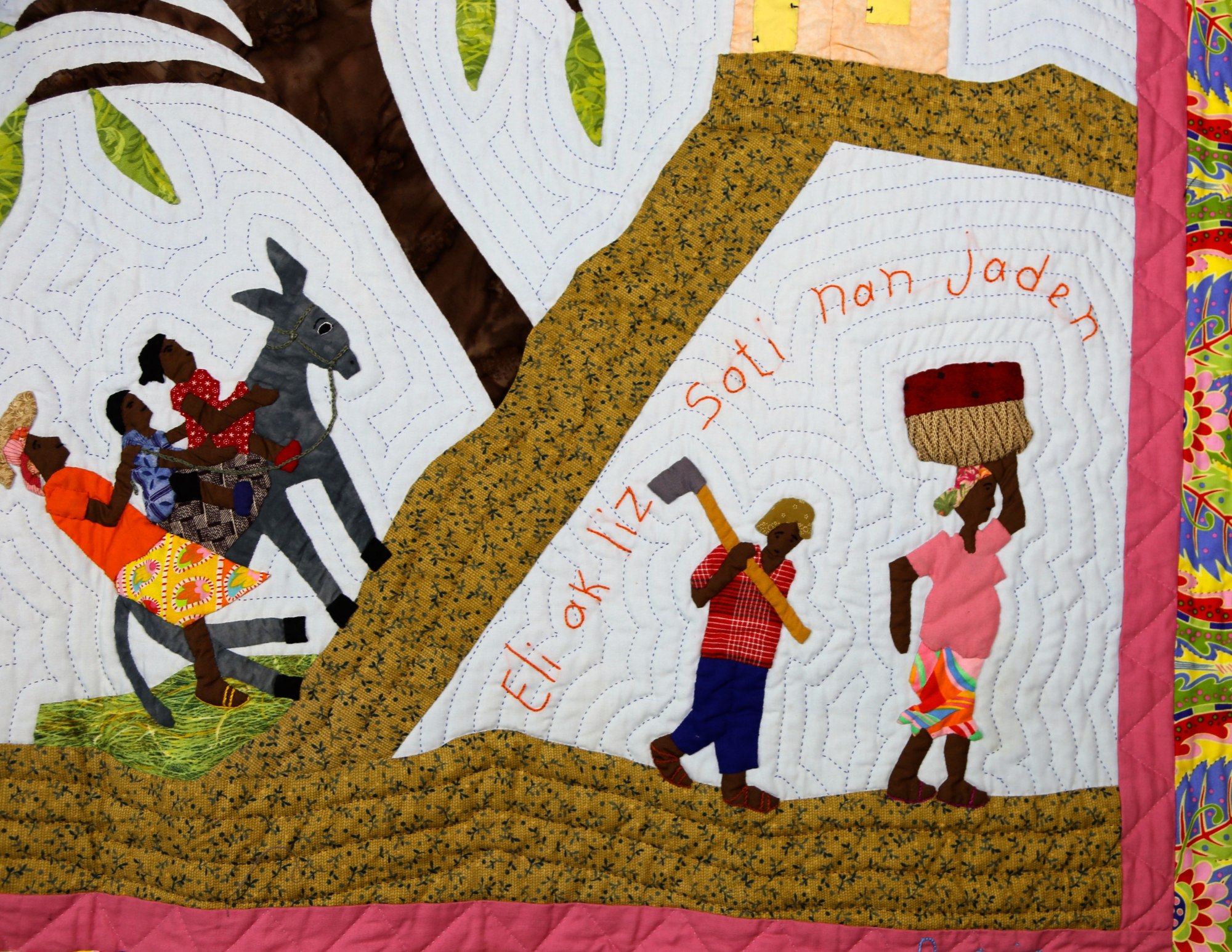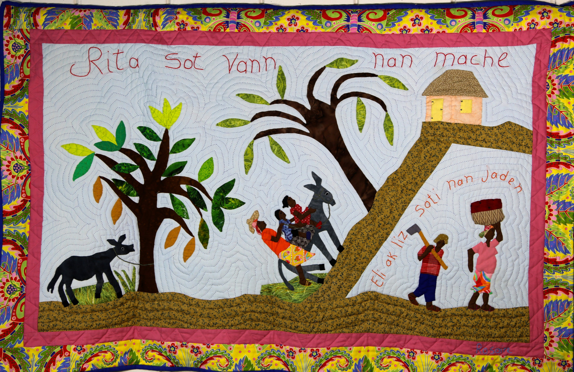 This delightful folk art interpretation of a typical day in the Haitian countryside demonstrates the artist's non-traditional depiction of space. The family rides together on their donkey to market, as their neighbors leave from their work tending their garden. Beautifully hand stitched throughout. 100% cotton. Sleeve on reverse for hanging. Complementary copy of Patience To Raise the Sun included with purchase.