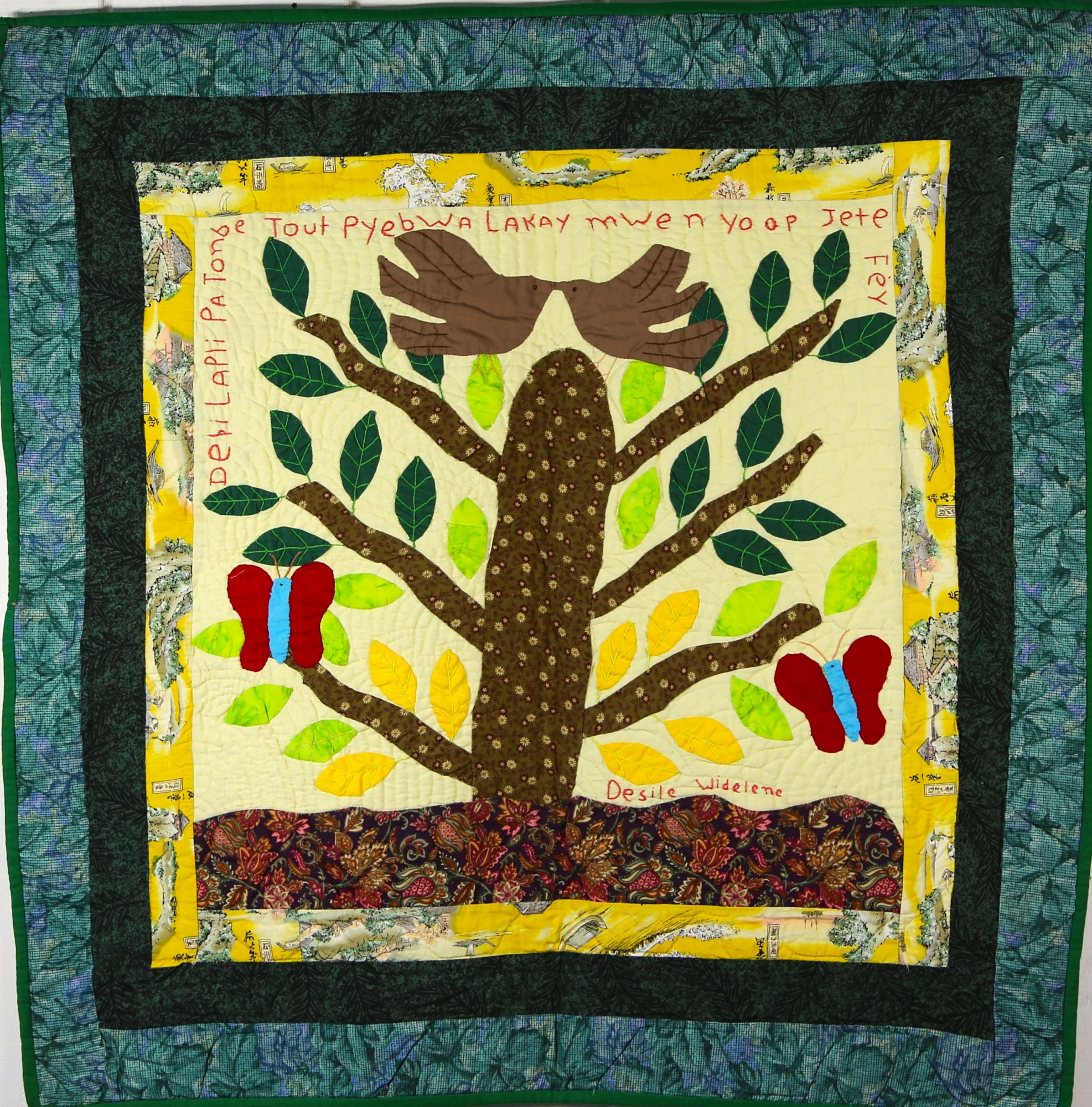 The rhythms of the seasons are an important part of Haitian life. So too, is the importance of trees in a country that has been largely deforested. The large, central tree stands strong and resilient with butterflies and birds sheltered in its foliage.