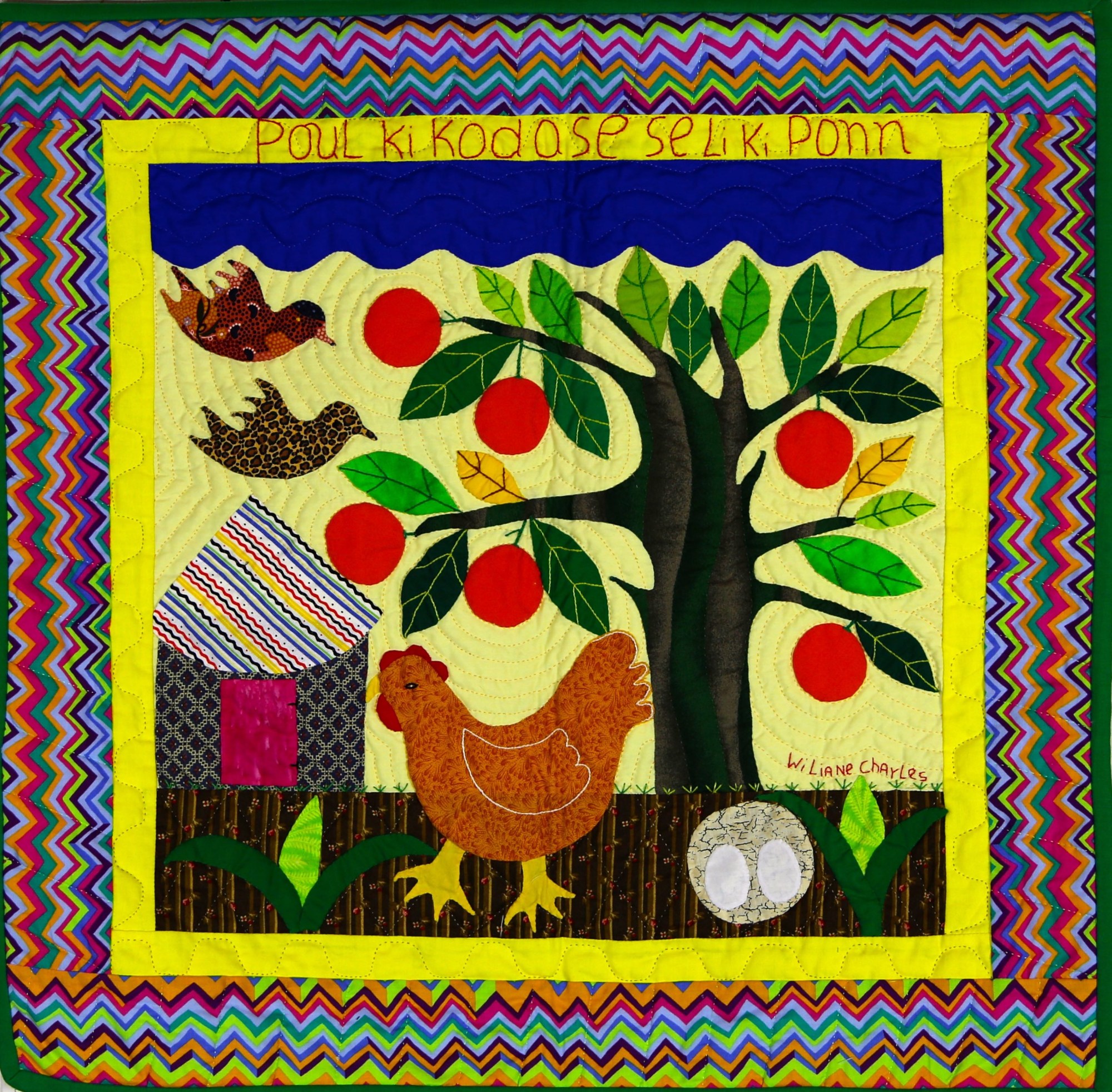 The title of this delightful piece is a Haitian proverb meaning 'The one who makes the most noise is the one who did it.' Treadle-machine pieced and meticulously hand-quilted of 100% cotton fabrics.