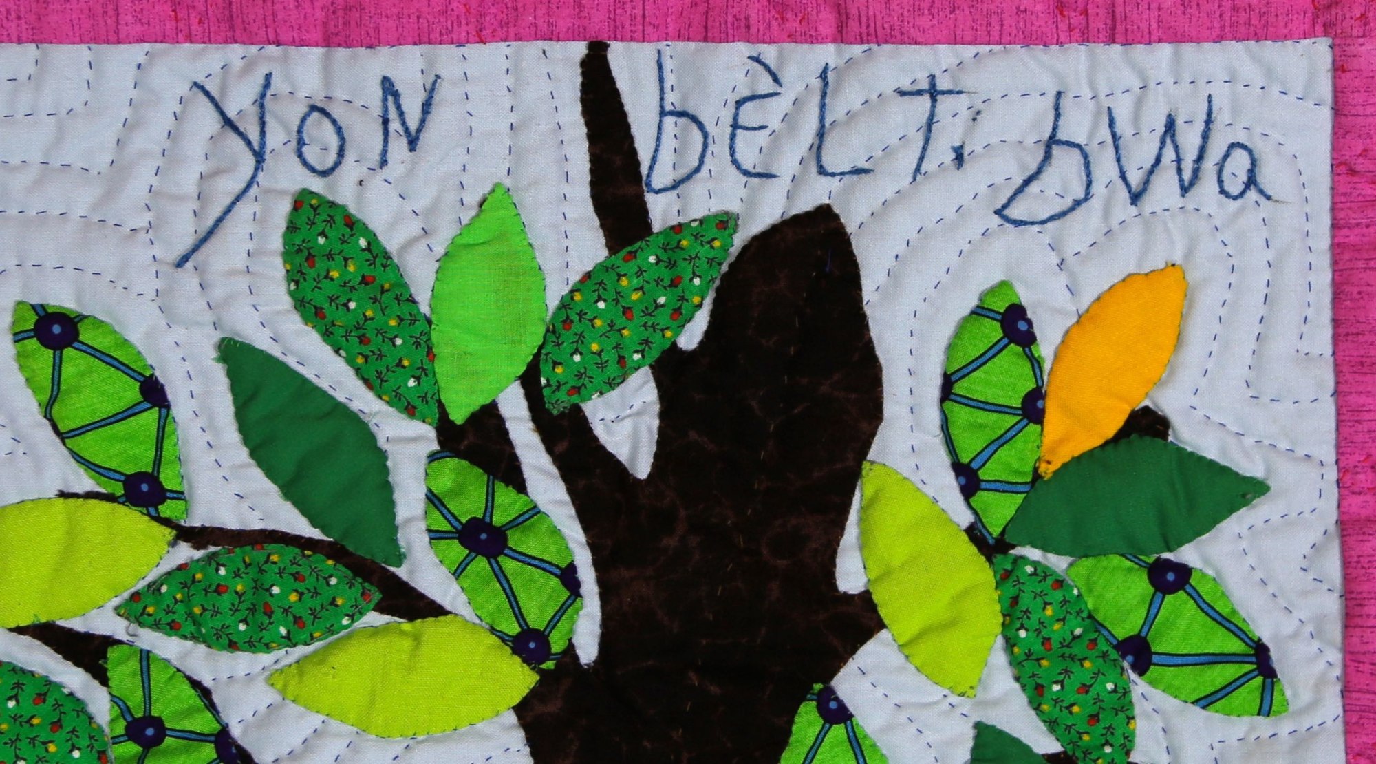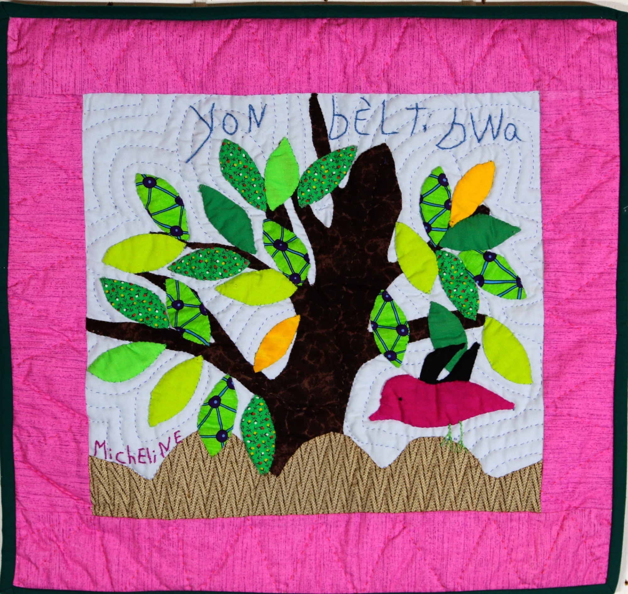 A sweet little bird flits about in this cheerful little tree! Hand appliquéd, quilted and embroidered on pieced cottons. Sleeve on reverse for hanging. Complementary copy of Patience To Raise the Sun included with your purchase.
