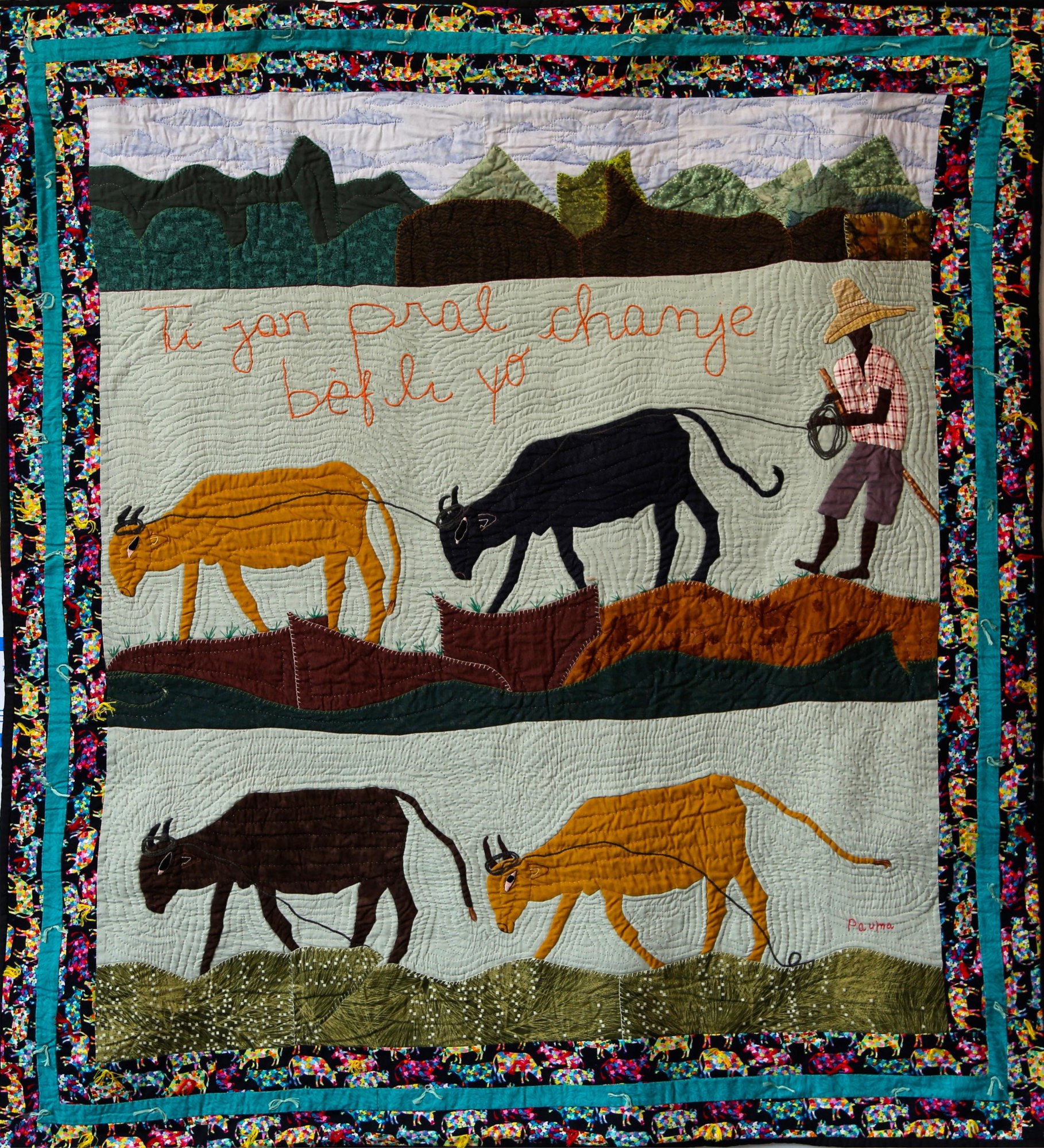 This depiction of life in rural Haiti illustrates the deep connection of farmers to their land and livestock. High in the mountains, the daily routines of tending herds has changed little for many generations. The quilt is pieced on a treadle sewing machine, then hand-appliquéd, embroidered and hand-quilted. Signed by the artist.