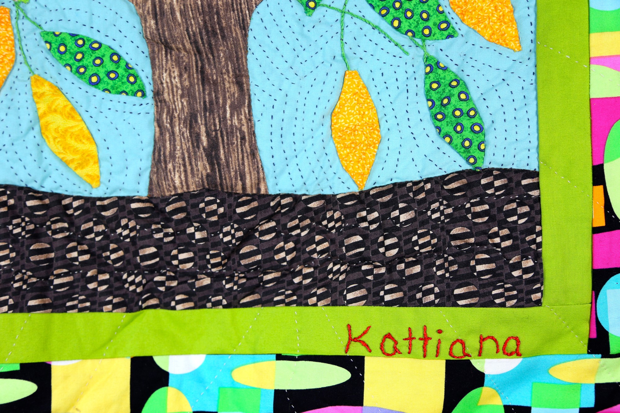 Beautiful echo quilting adds to the shimmering leaves in this joyful tree of life quilt, sure to brighten any room in your house! Artist Kattiana is the newest member of Solidarity Cooperative. Hand-appliquéd, quilted and embroidered of 100% cotton. Sleeve on reverse for hanging. 20.5x21.5 inches.