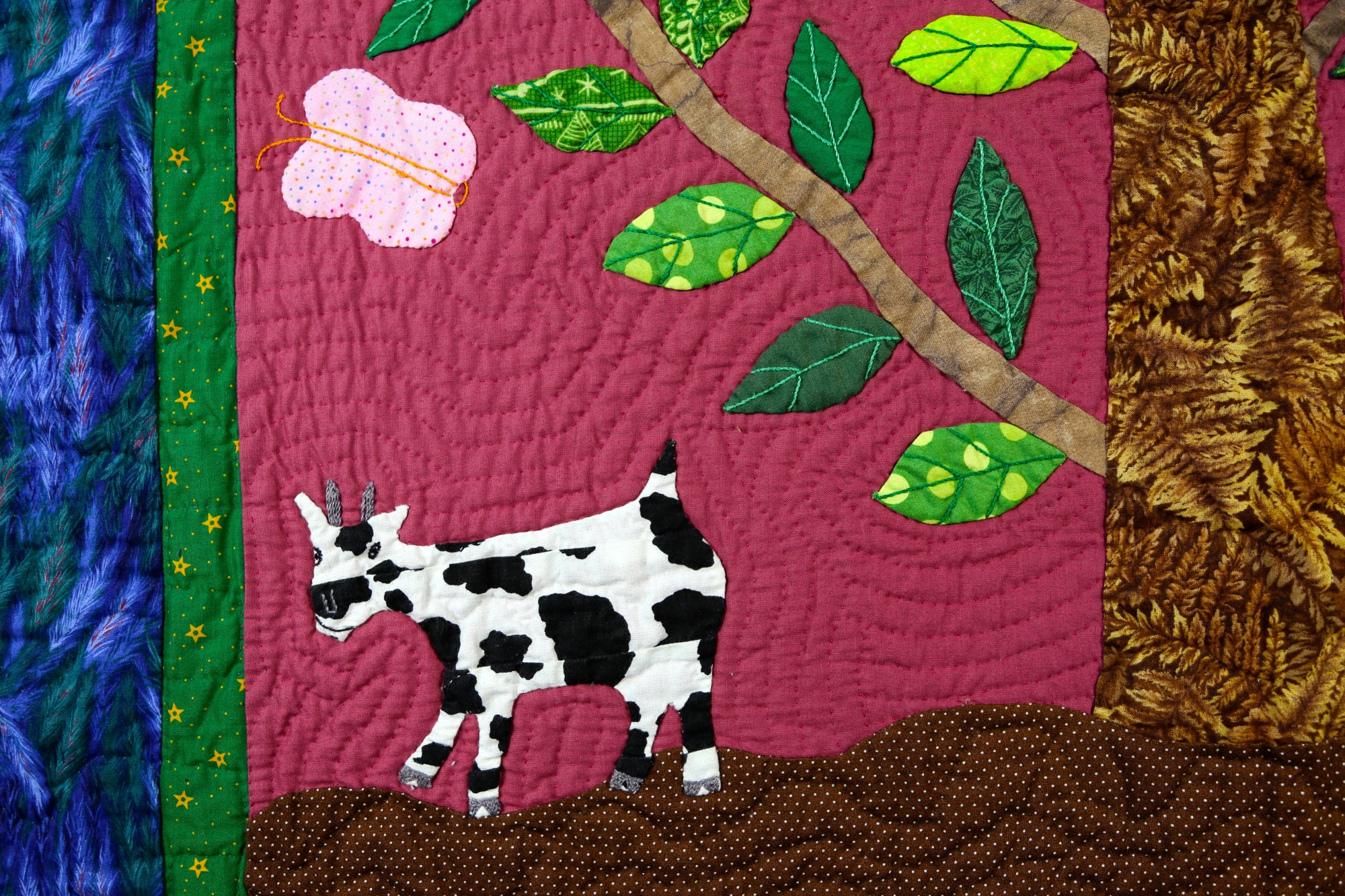 In Haiti, trees are truly 'trees of life'. Artist Wiliane Charles depicts a tree brimming with life where butterflies flit, birds alight, and a goat meanders by. Pieces and scraps of cotton are pieced on a treadle sewing machine. All appliqué, embroidery and quilting is by hand. A complementary copy of Patience To Raise the Sun exhibition catalogue is included with your purchase.