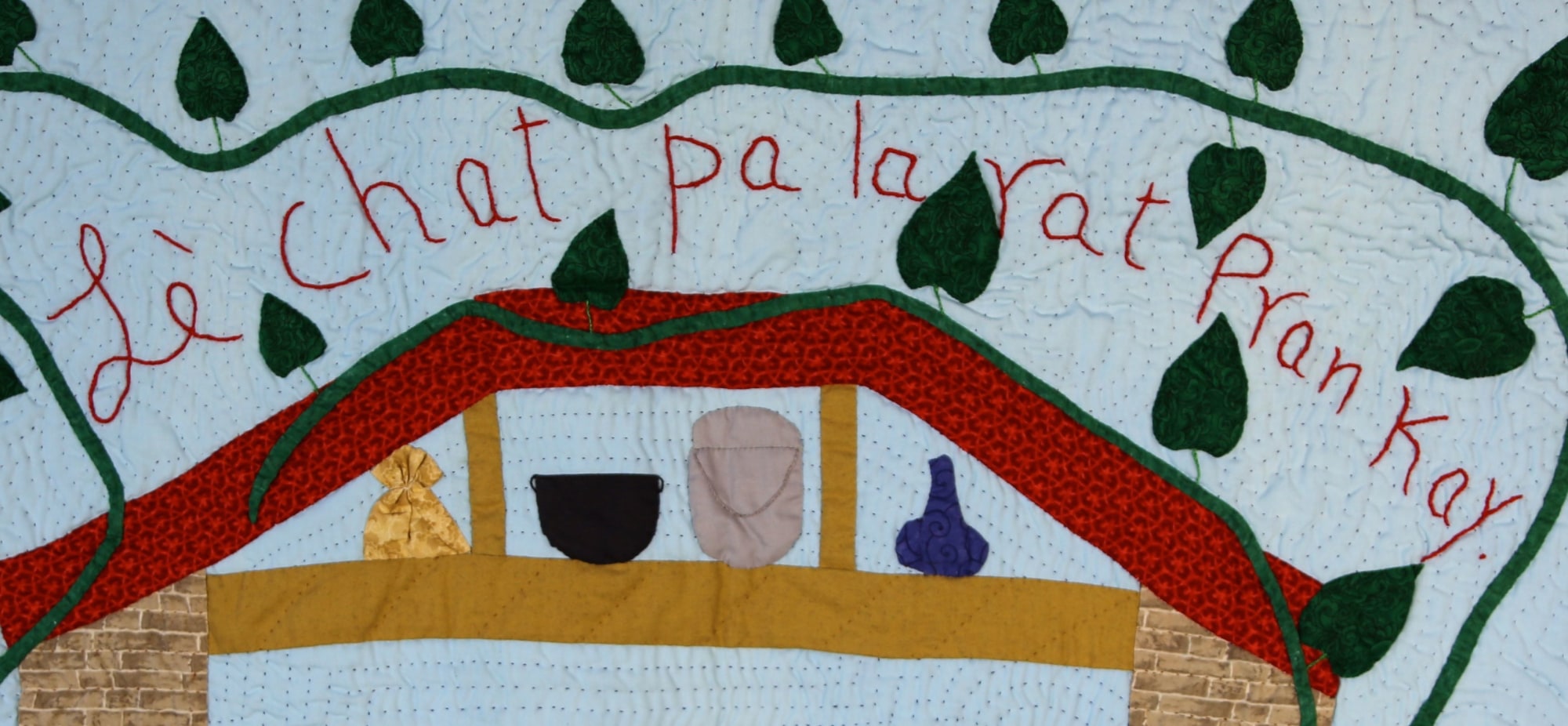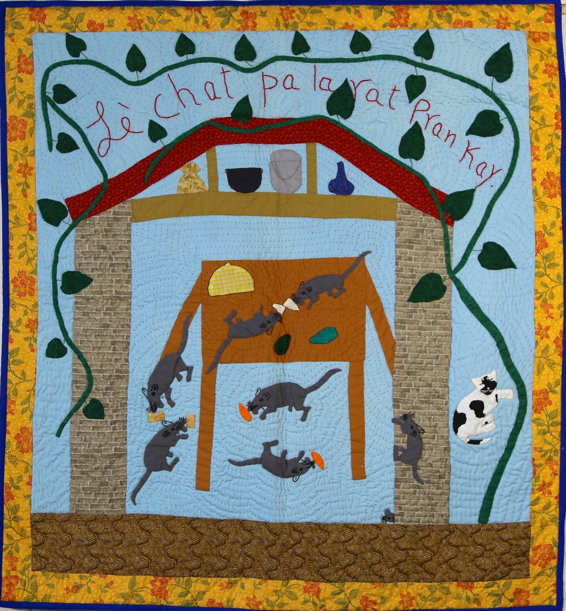 This Haitian proverb is well known to Americans, here illustrated by a group of gamboling mice stealing food from the table and having the run of the house. A beautifully realized quilt, made by Rose Marie Agnant, one of the premier Haitian quilt artists whose work has been exhibited in galleries and museum exhibitions.