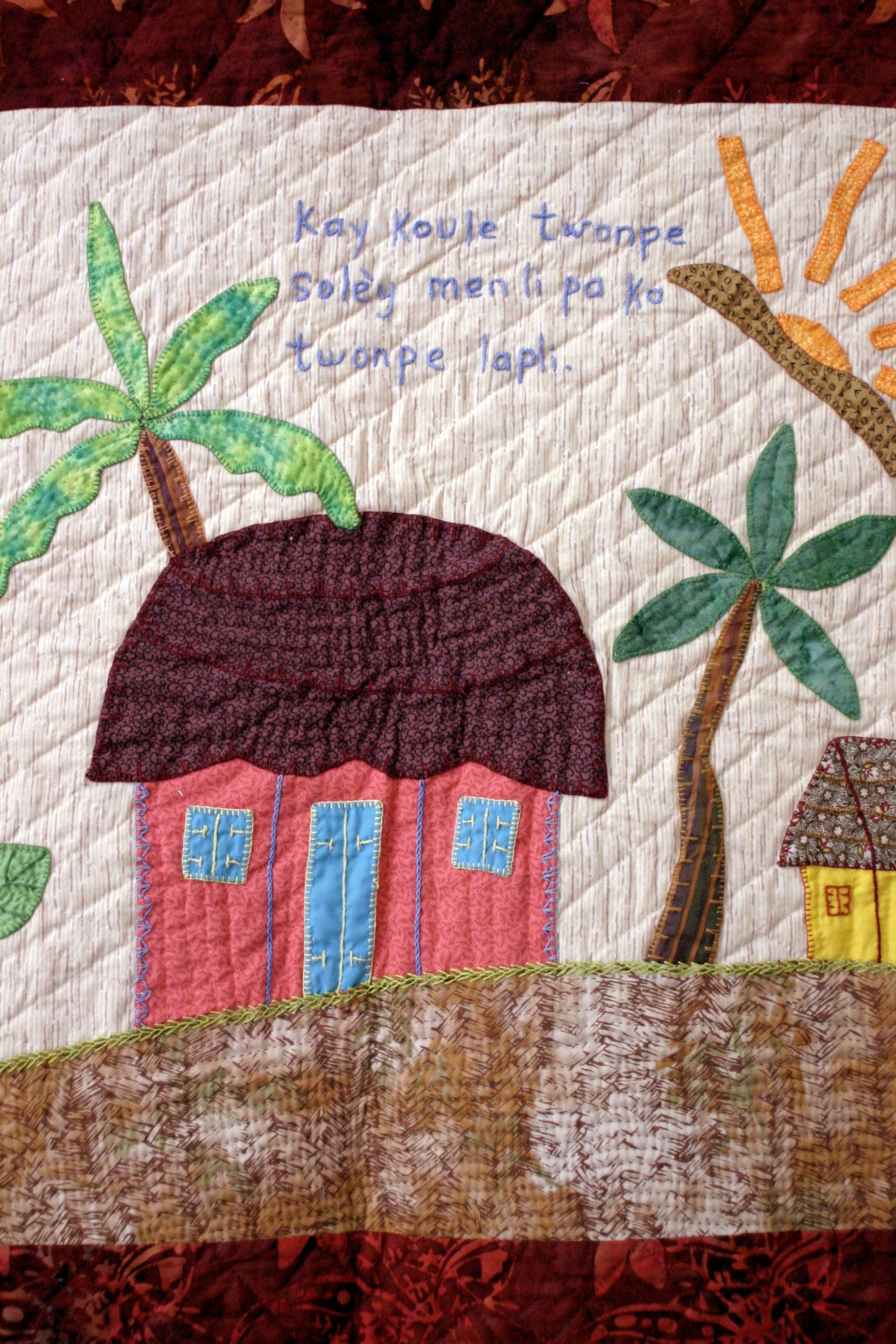 This charming quilt illustrates the Haitian proverb, 'A leaky roof may fool the sun, but can not fool the rain.' How true that is! The landscape is dotted with 'ti kay', typical country houses, with swaying trees and the sun shining overhead. Treadle-machine pieced of 100% cotton, with hand appliqué, embroidery and quilting. Sleeve on reverse for hanging. A complementary copy of Patience To Raise the Sun exhibition catalogue included with purchase. This quilt was featured in this exhibition, as well as in a special exhibit at the 2017 Houston International Quilt Festival.