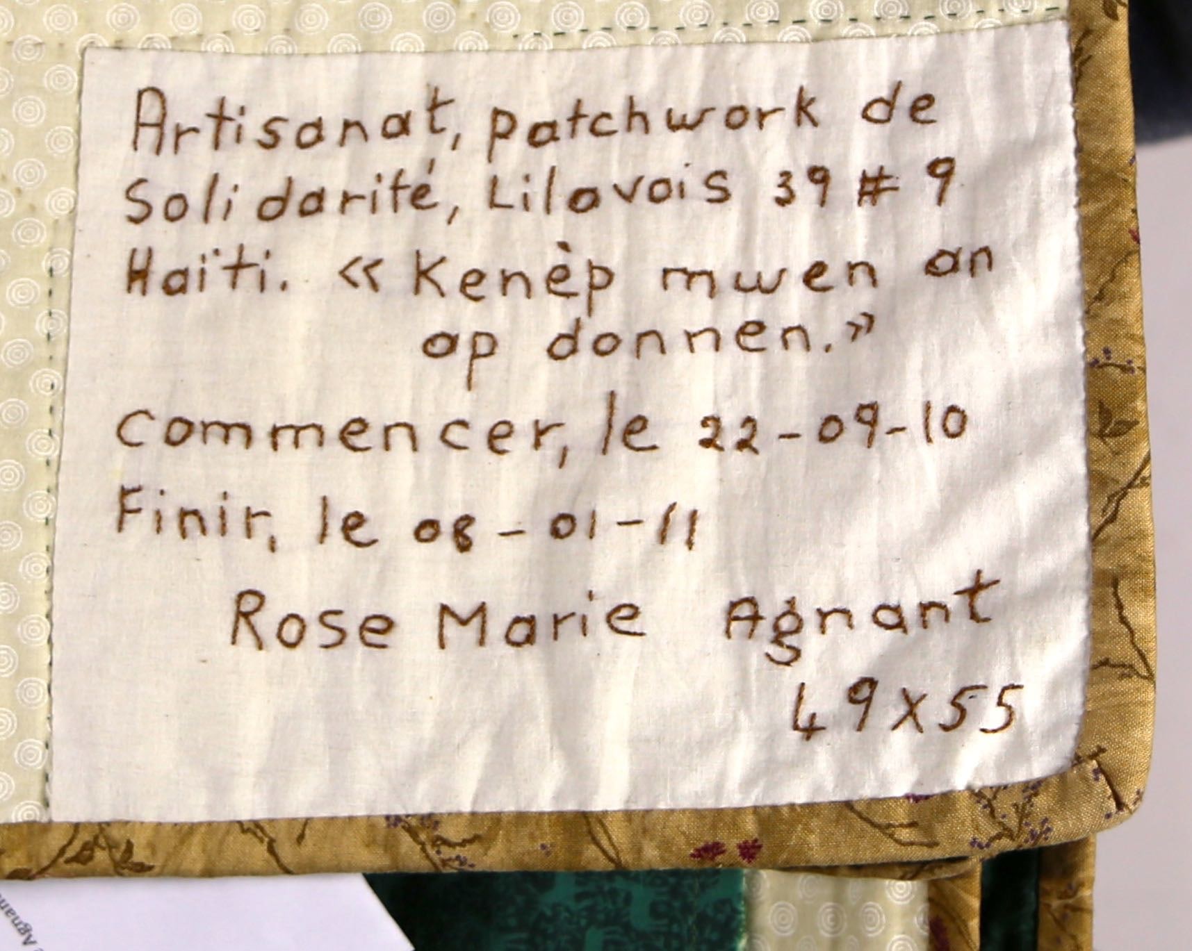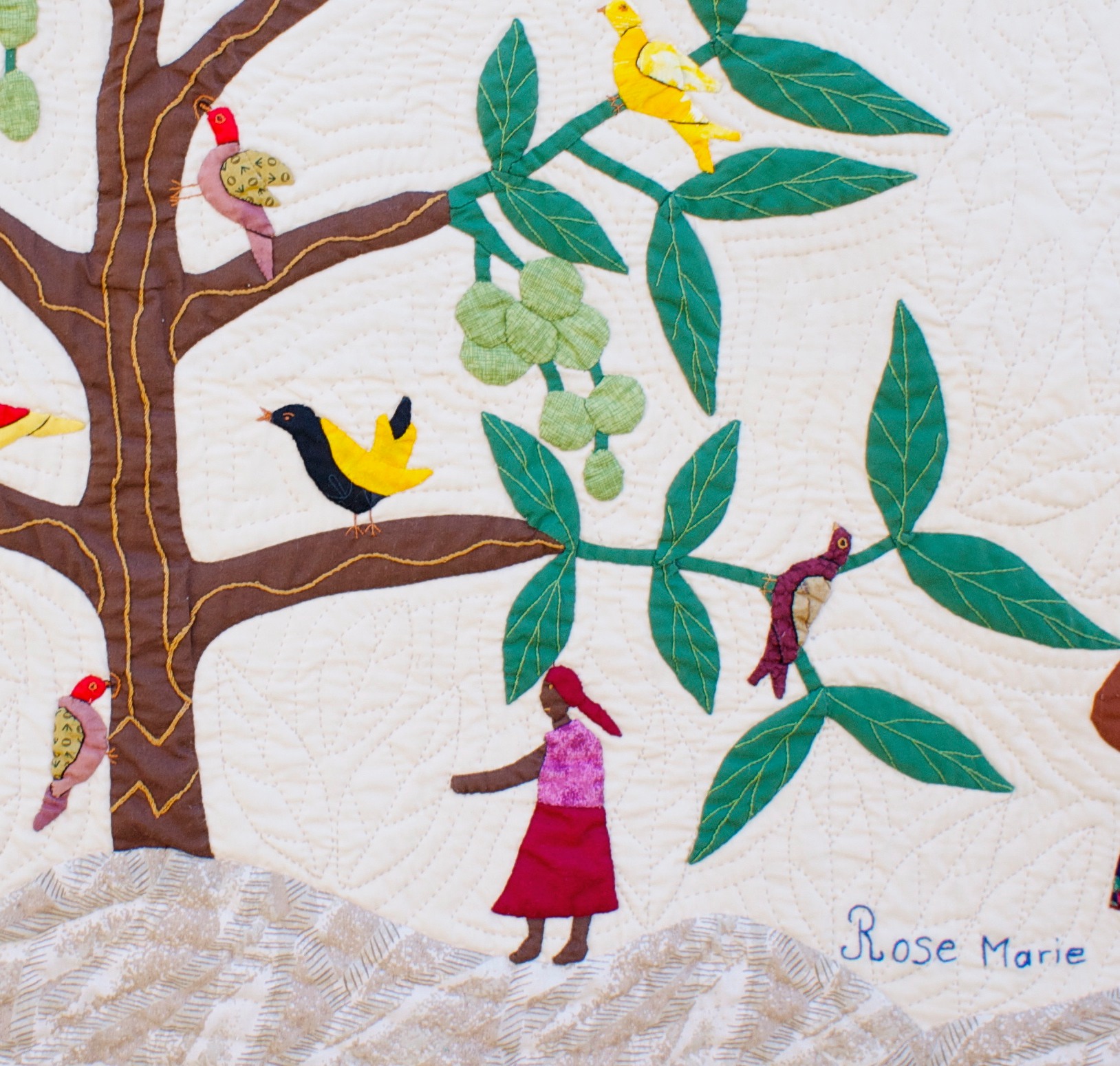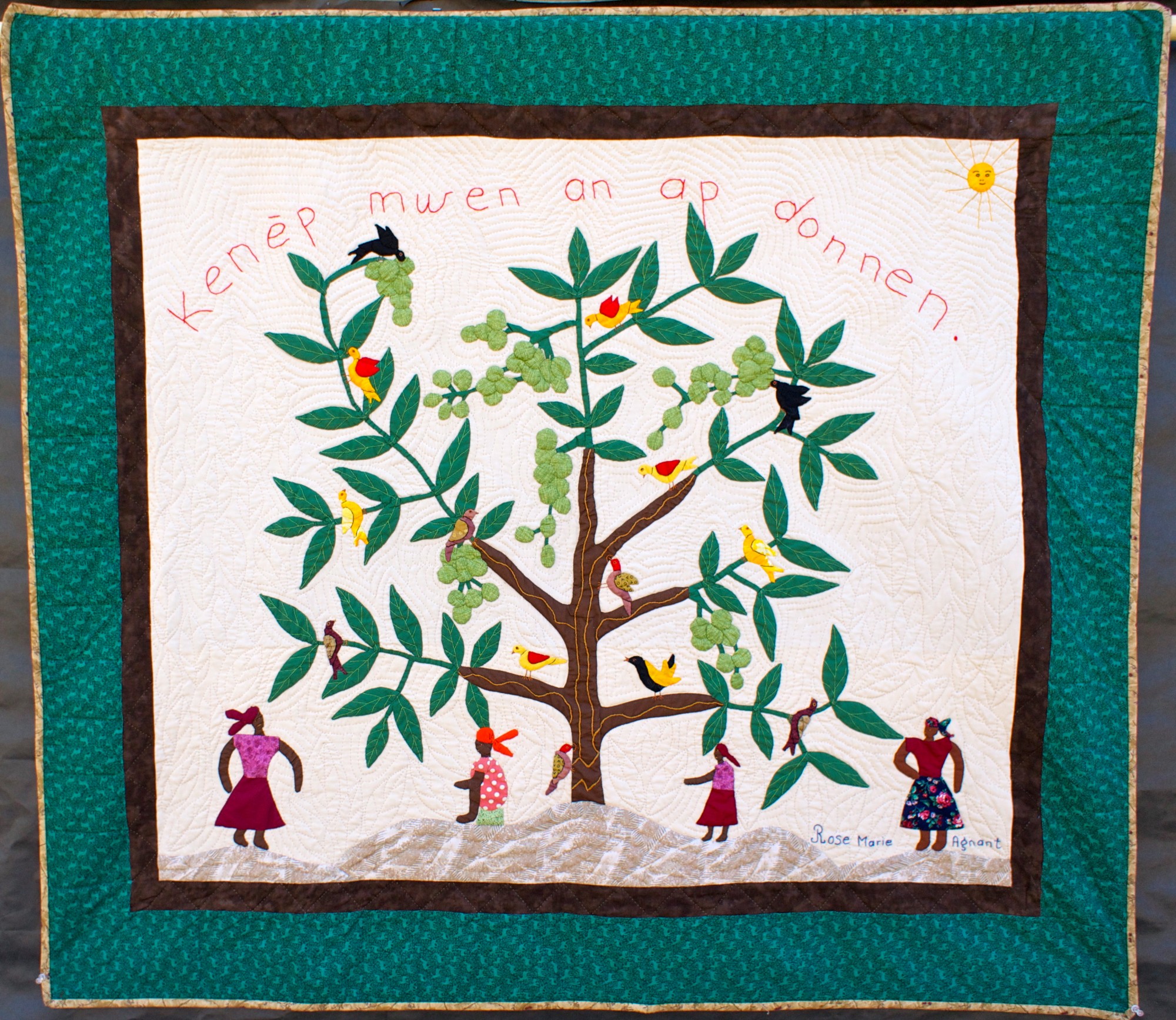 The tree of life is an image which is frequent subject in Haitian quilts. In this work by Rose Marie Agnant, she has personalized it by drawing inspiration from a kenep tree (also known as Spanish lime) next to her house. Small garden patches and backyard fruit-bearing trees are often an important source of food for families.