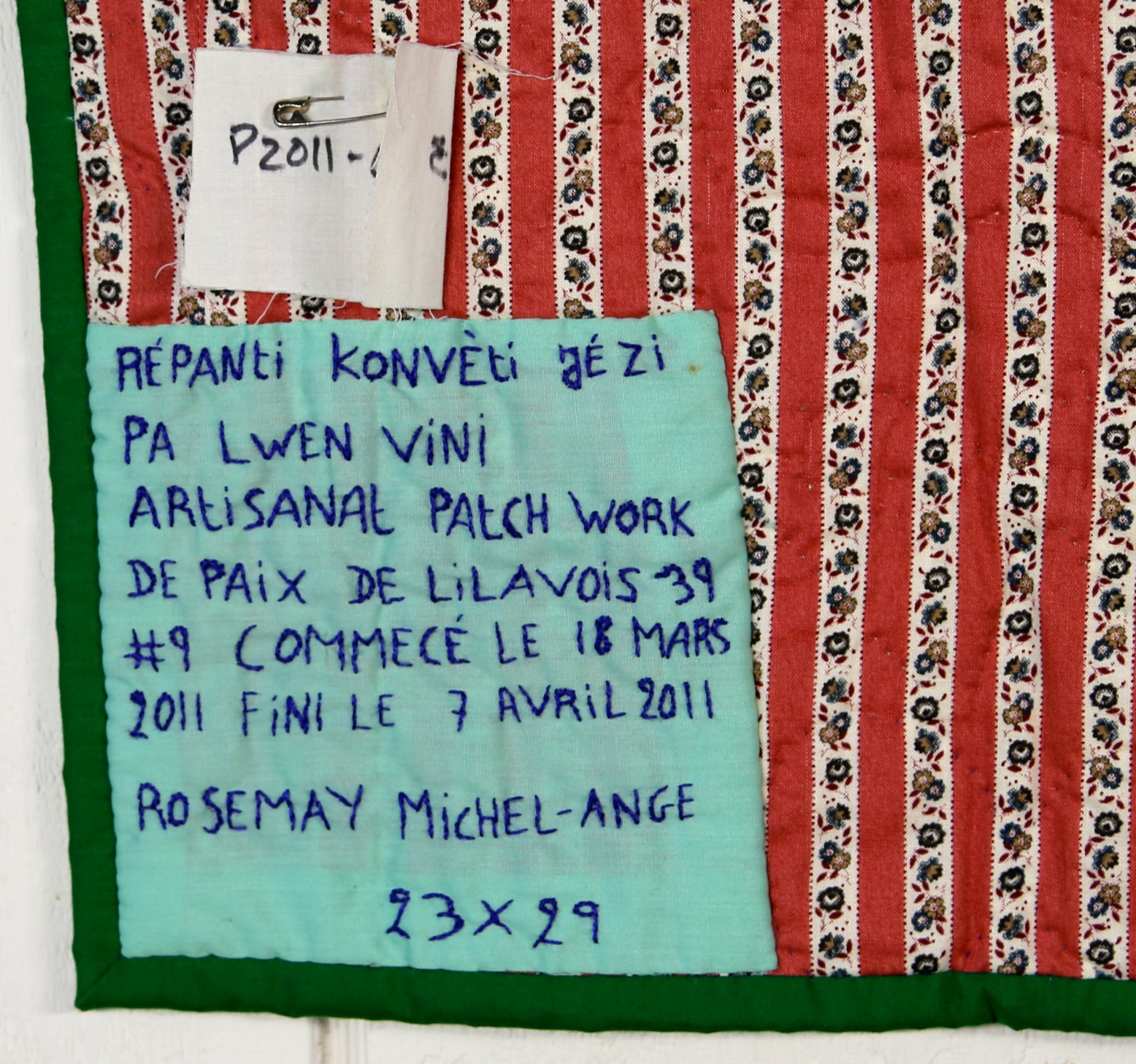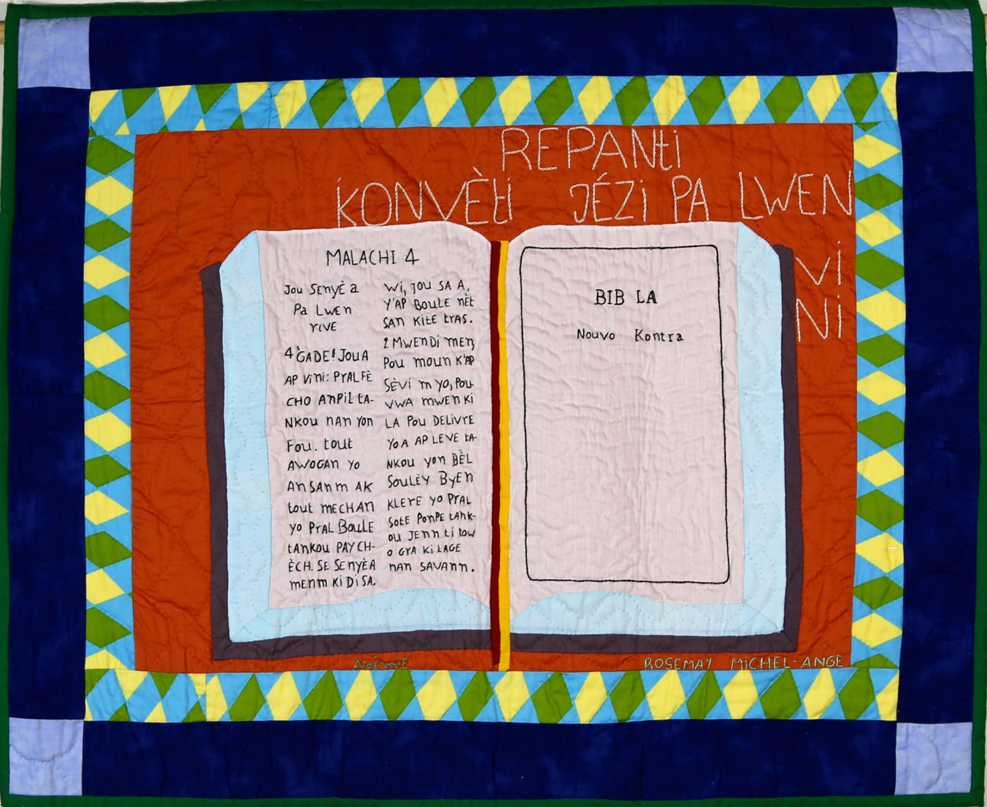 Religion is a very important part of most Haitian's lives. There's a saying that Haiti is 80% Roman Catholic but 100% Vodou. While this is not strictly true, the majority of Haitians do practice at least some aspects of Vodou. In more recent year, Evangelical Protestants have grown in numbers. In this quilt, the artist exhorts the viewer to repent and be saved.
