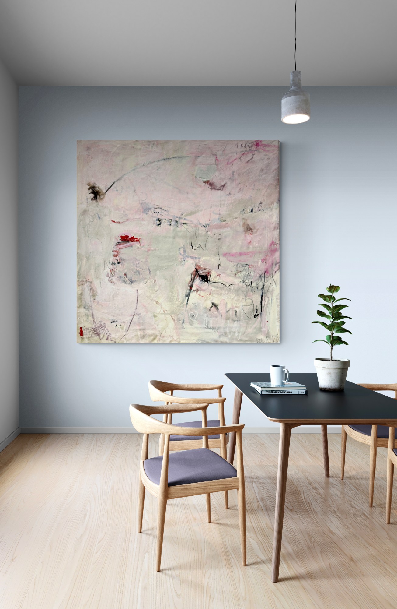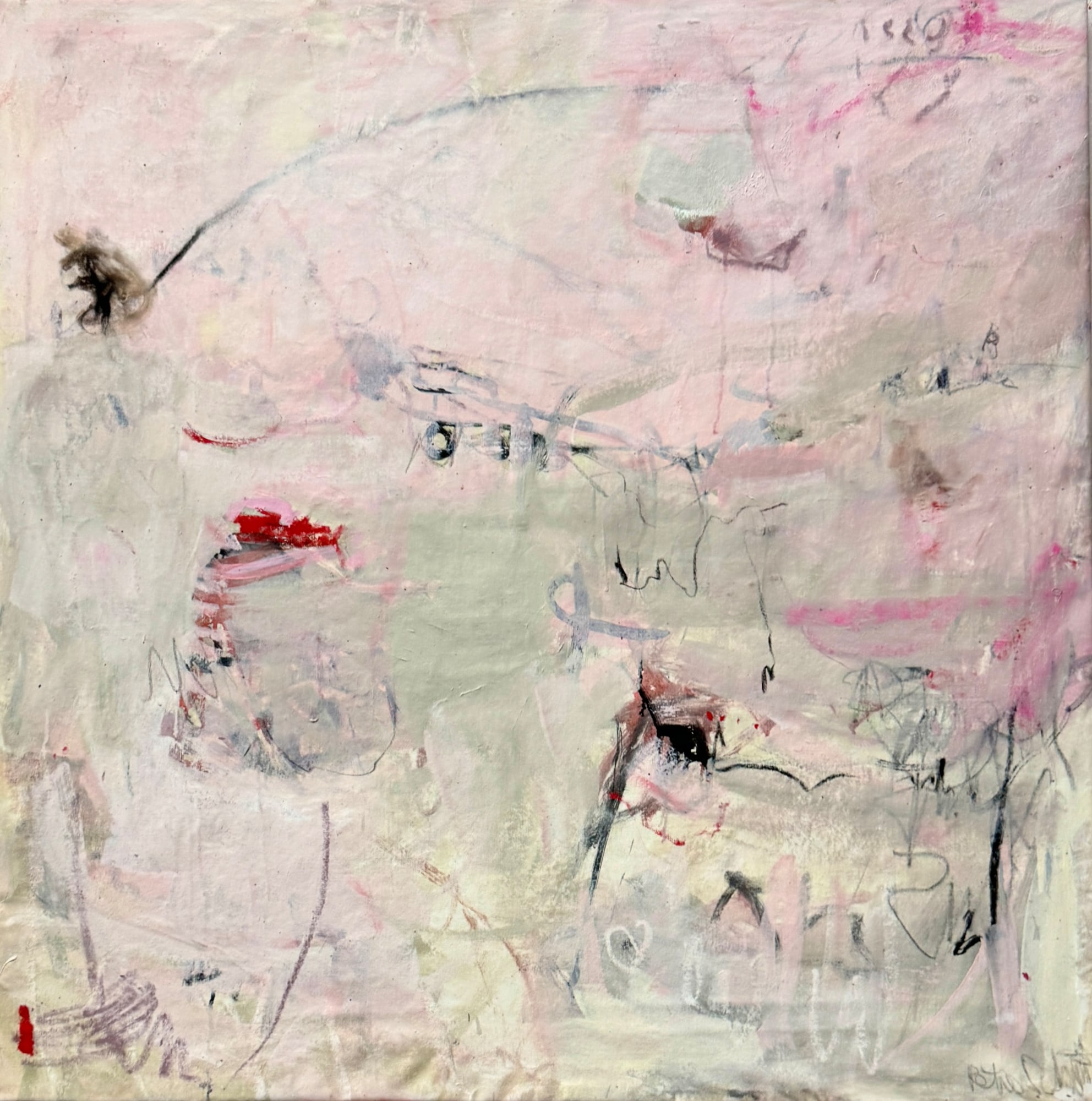 This painting - the third one in this series - exudes an ethereal charm with its soft rosé layers, creating an atmosphere that feels almost weightless and suspended in space. The subtle shapes and lines delicately trace the contours of human bodies, providing an intriguing and dreamlike quality to the viewer's experience. The artwork beckons the observer to explore the realm of sensations, transcending the confines of the physical form. The inclusion of oil paints not only enhances its luminosity but also contributes to the overall depth, adding an extra layer of richness to the captivating narrative.