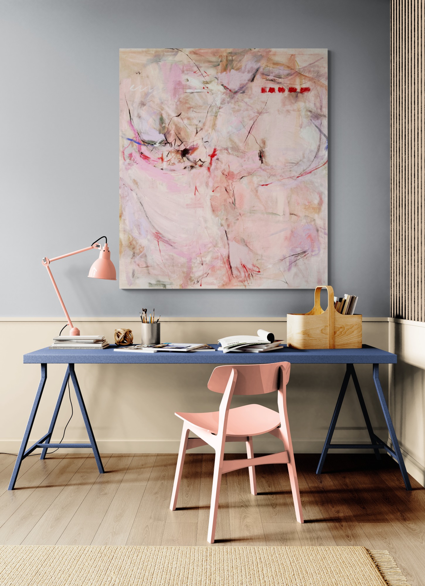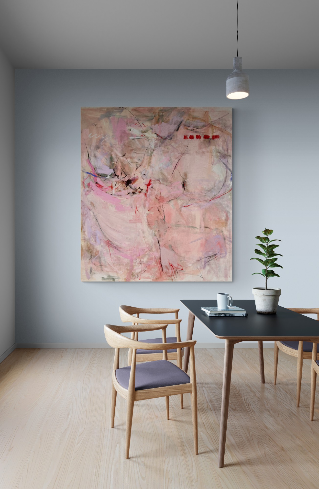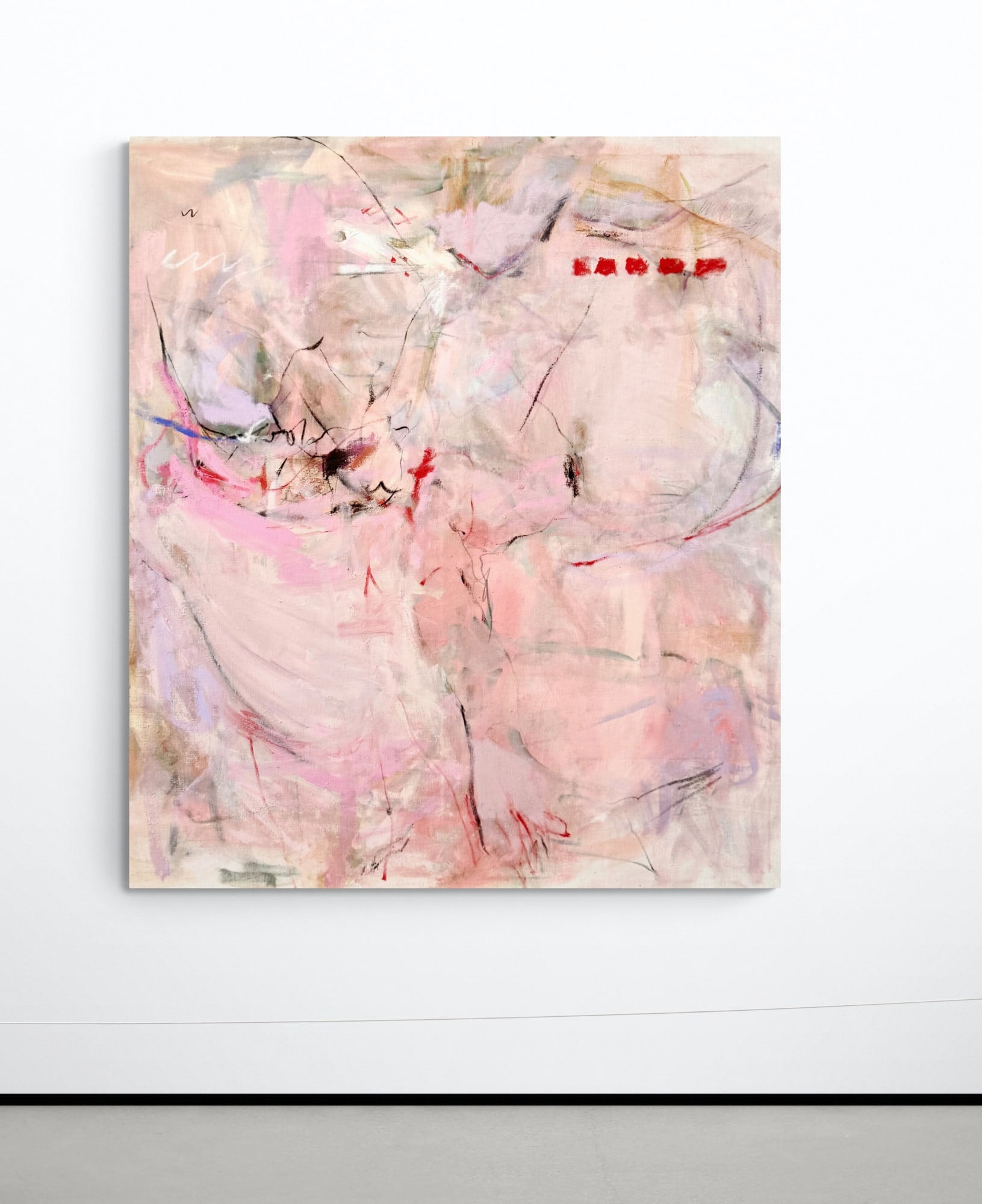 Like the first painting, this one too exudes an ethereal charm with its soft rosé layers, creating an atmosphere that feels almost weightless and suspended in space. The subtle shapes and lines delicately trace the contours of a human body, providing an intriguing and dreamlike quality to the viewer's experience. The artwork beckons the observer to explore the realm of sensations, transcending the confines of the physical form. The inclusion of oil paints not only enhances its luminosity but also contributes to the overall depth, adding an extra layer of richness to the captivating narrative.