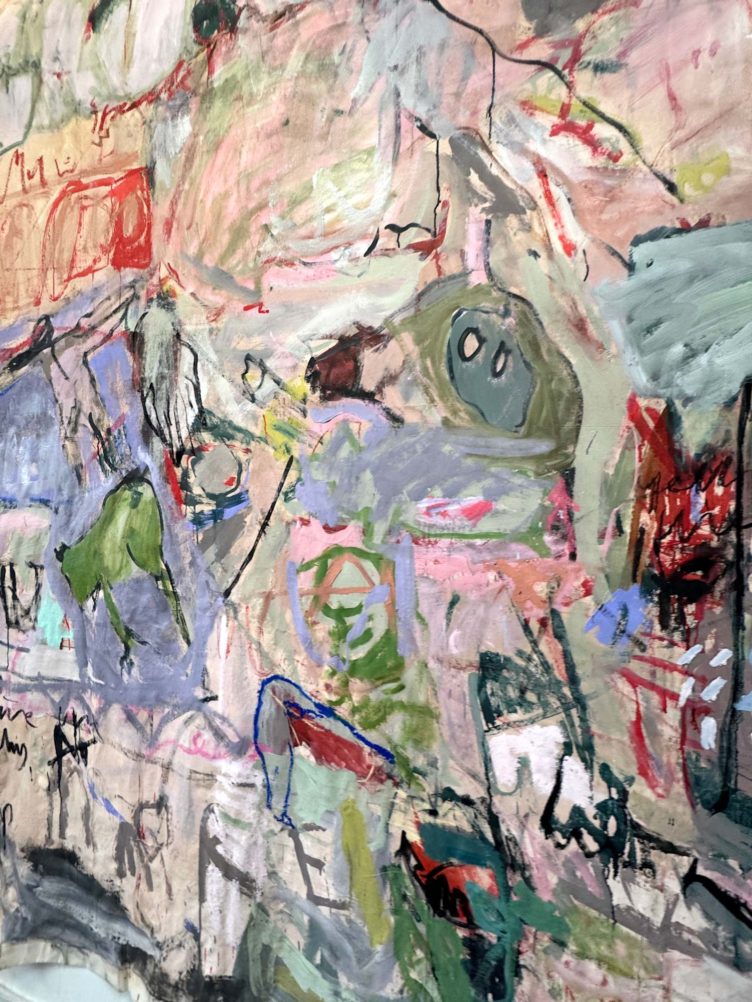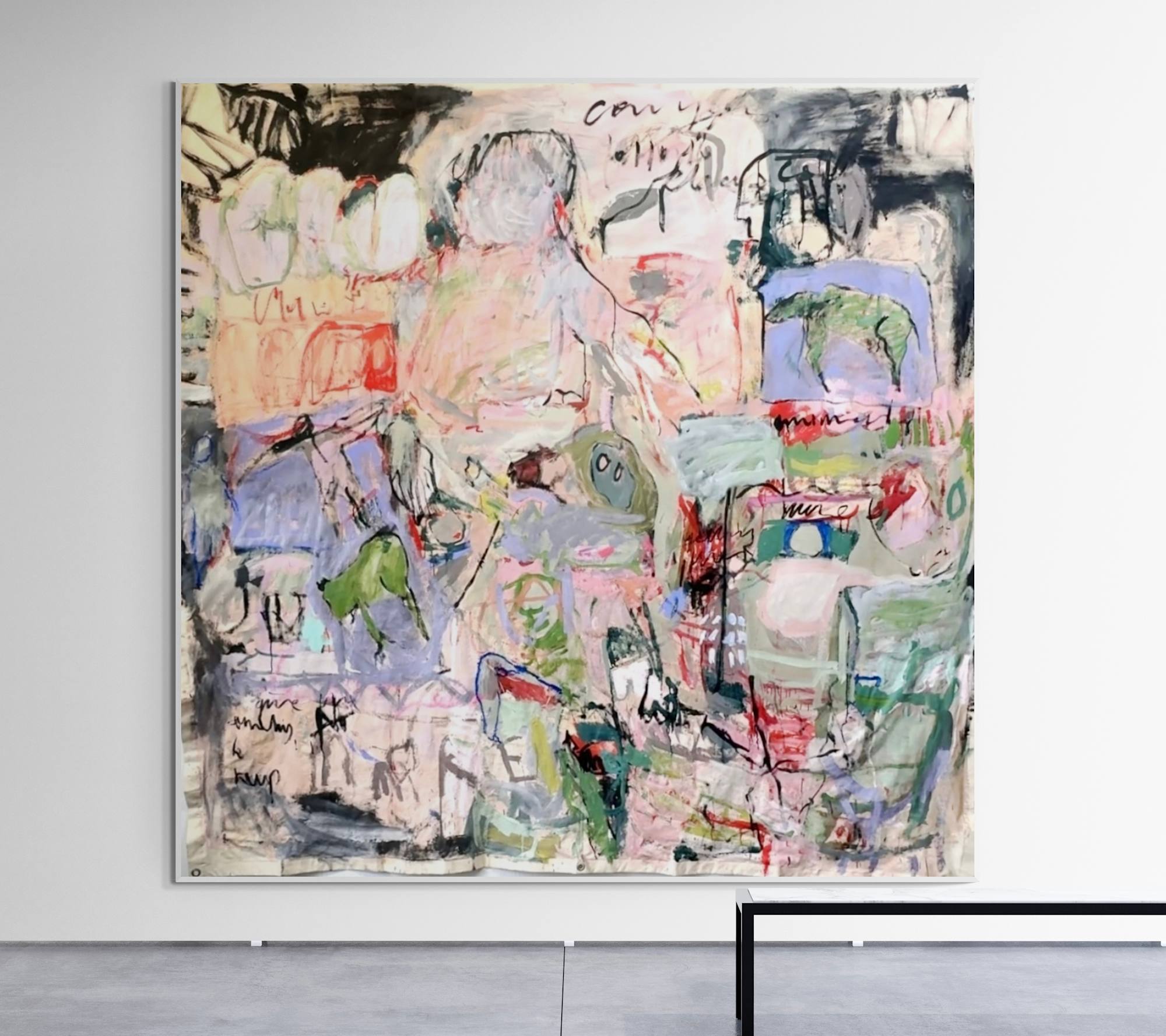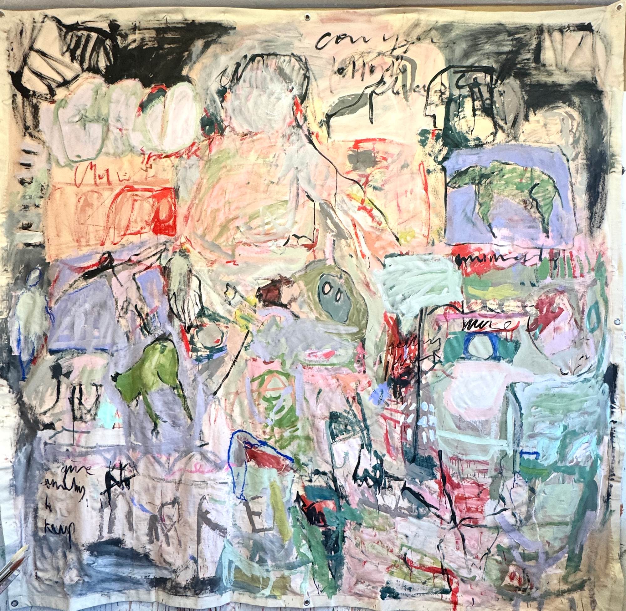 This large-scale piece hanging unstretched like a carpet is a vivid, associative collage of the artist's life, created through a dynamic and intuitive process. Human figures of varying sizes emerge across the canvas, coming and going like scenes in a film . These figures are woven into a tapestry of everyday life, dreams, and memories, forming a complex narrative. Scribblings and sketches further enrich this emotionally charged work, contributing to its raw, expressive power.