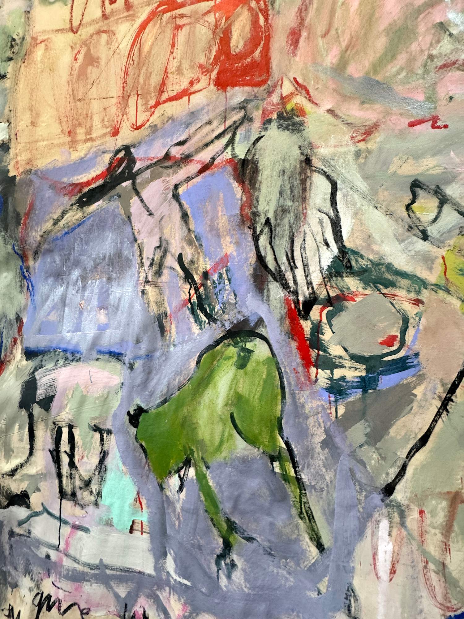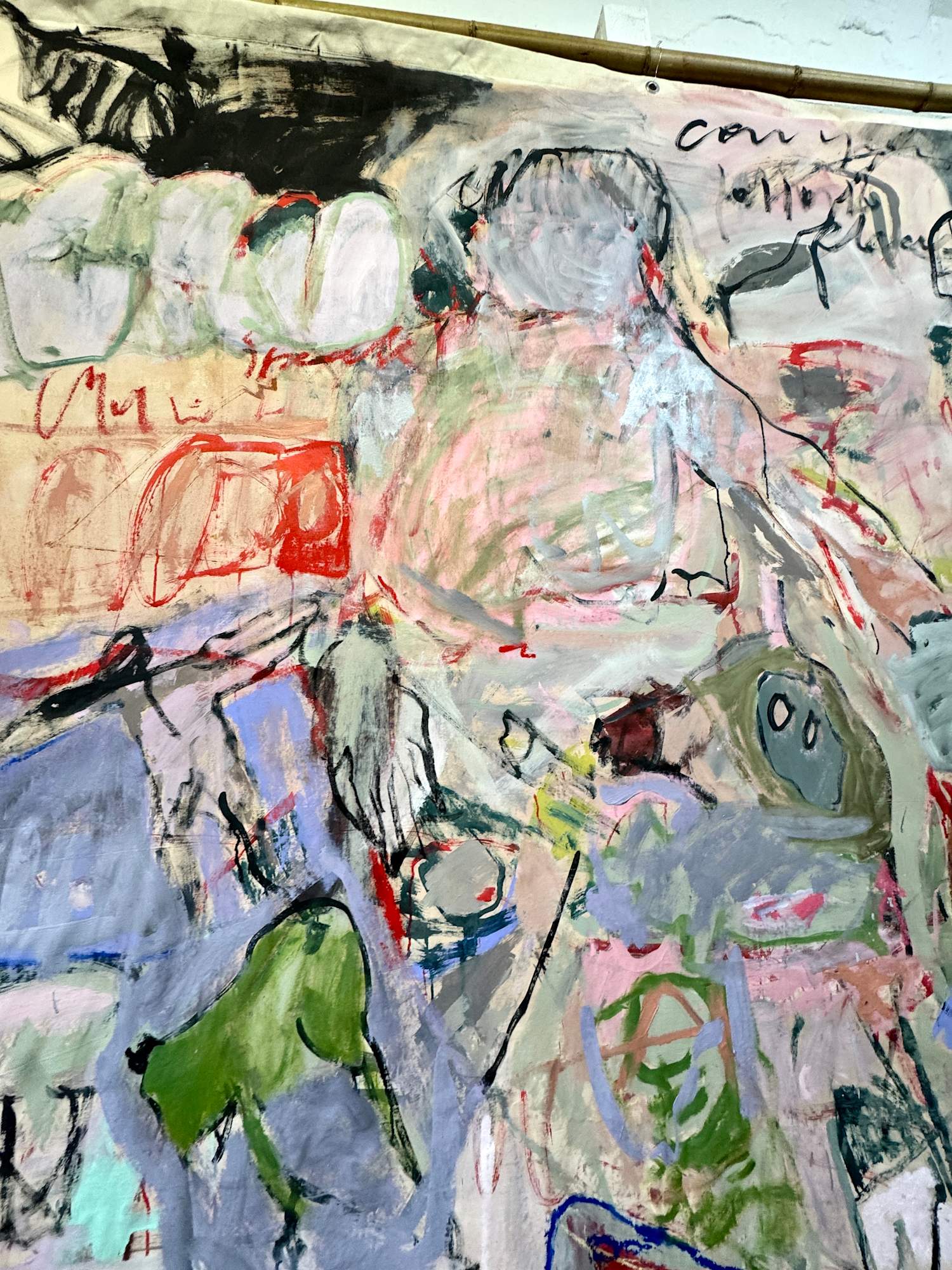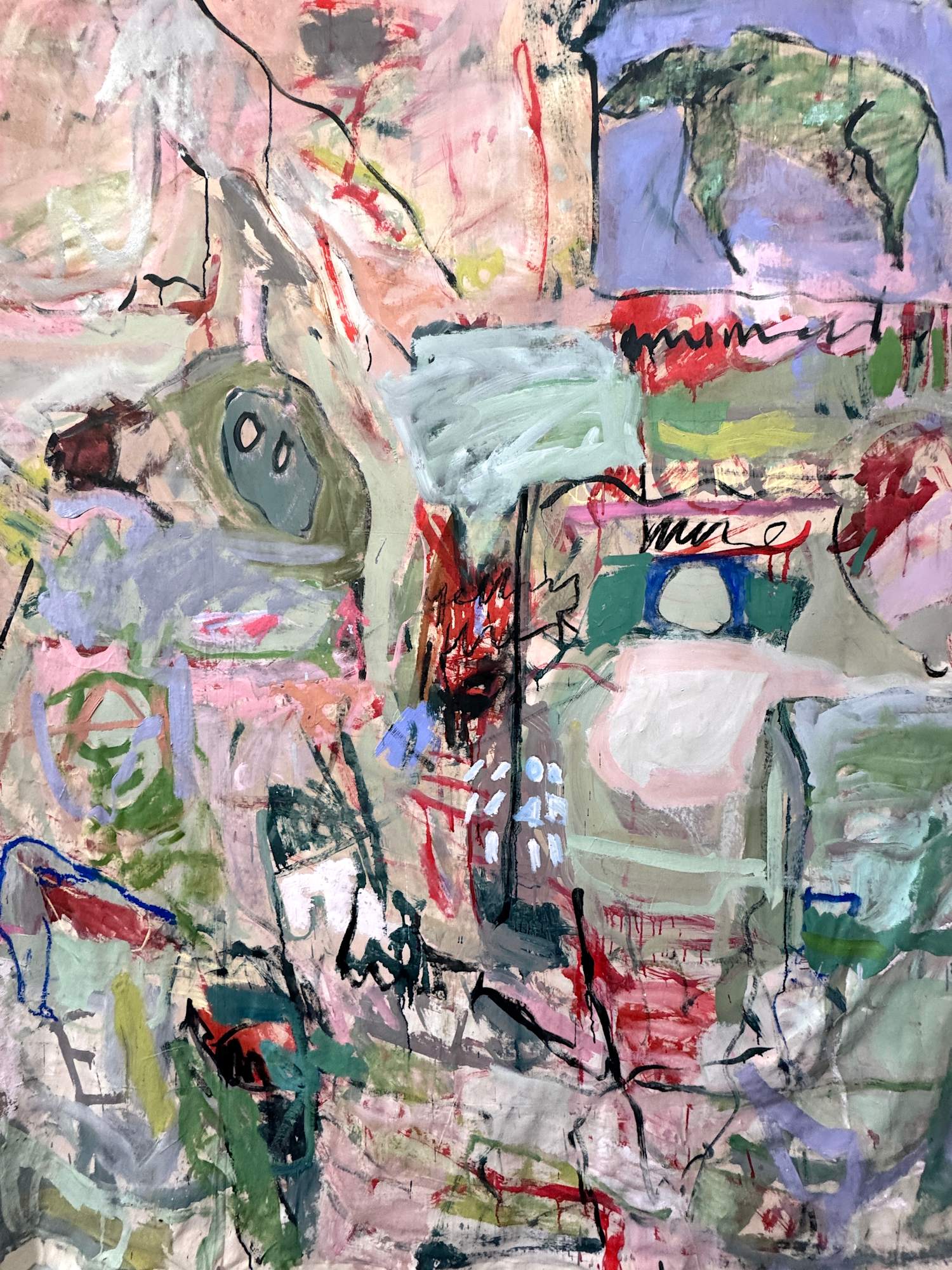 This large-scale piece hanging unstretched like a carpet is a vivid, associative collage of the artist's life, created through a dynamic and intuitive process. Human figures of varying sizes emerge across the canvas, coming and going like scenes in a film . These figures are woven into a tapestry of everyday life, dreams, and memories, forming a complex narrative. Scribblings and sketches further enrich this emotionally charged work, contributing to its raw, expressive power.