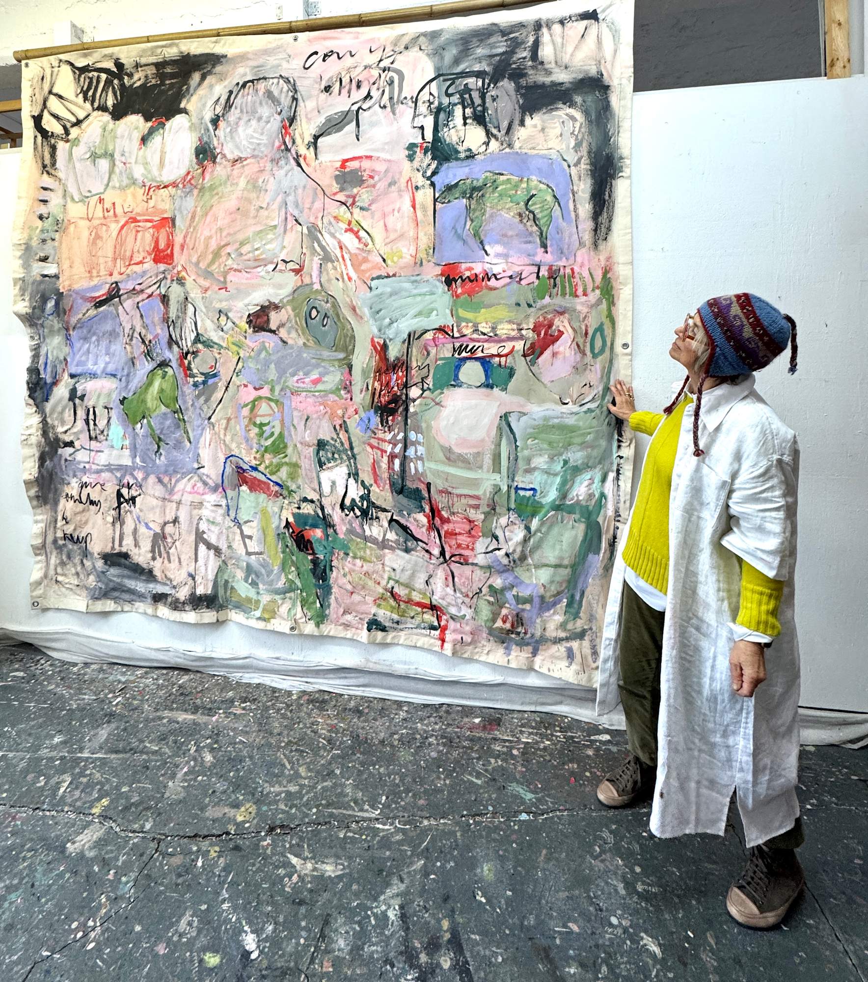 This large-scale piece hanging unstretched like a carpet is a vivid, associative collage of the artist's life, created through a dynamic and intuitive process. Human figures of varying sizes emerge across the canvas, coming and going like scenes in a film . These figures are woven into a tapestry of everyday life, dreams, and memories, forming a complex narrative. Scribblings and sketches further enrich this emotionally charged work, contributing to its raw, expressive power.