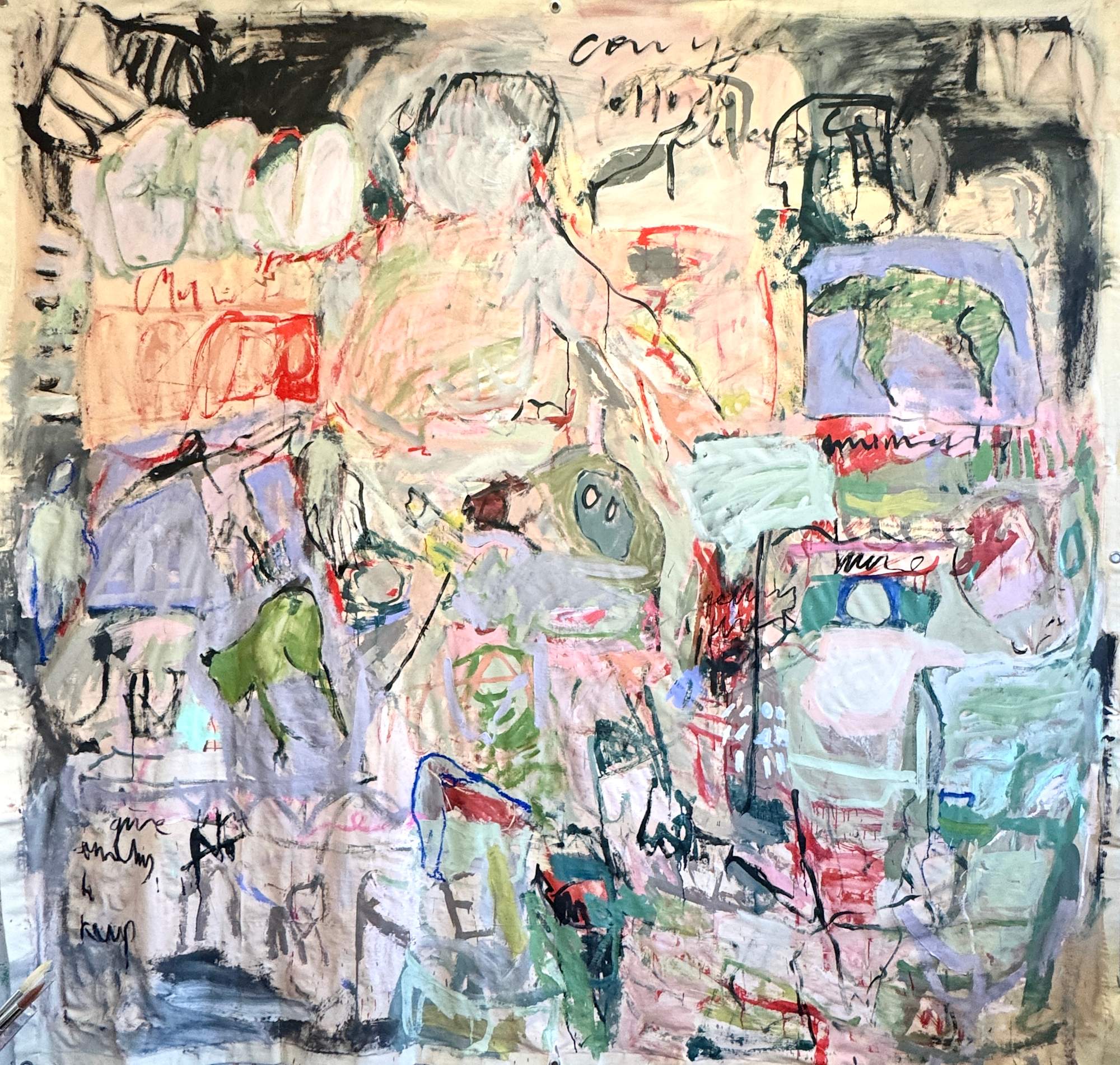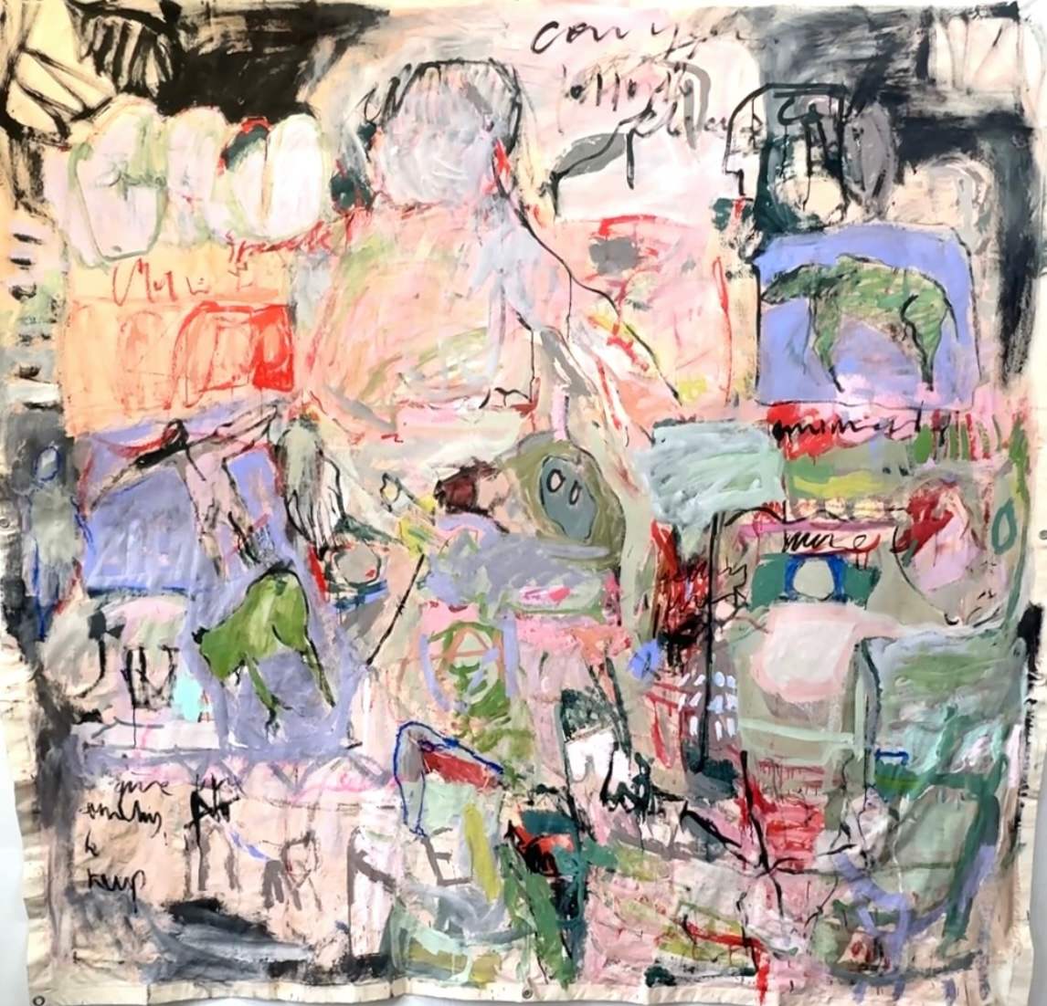 This large-scale piece hanging unstretched like a carpet is a vivid, associative collage of the artist's life, created through a dynamic and intuitive process. Human figures of varying sizes emerge across the canvas, coming and going like scenes in a film . These figures are woven into a tapestry of everyday life, dreams, and memories, forming a complex narrative. Scribblings and sketches further enrich this emotionally charged work, contributing to its raw, expressive power.