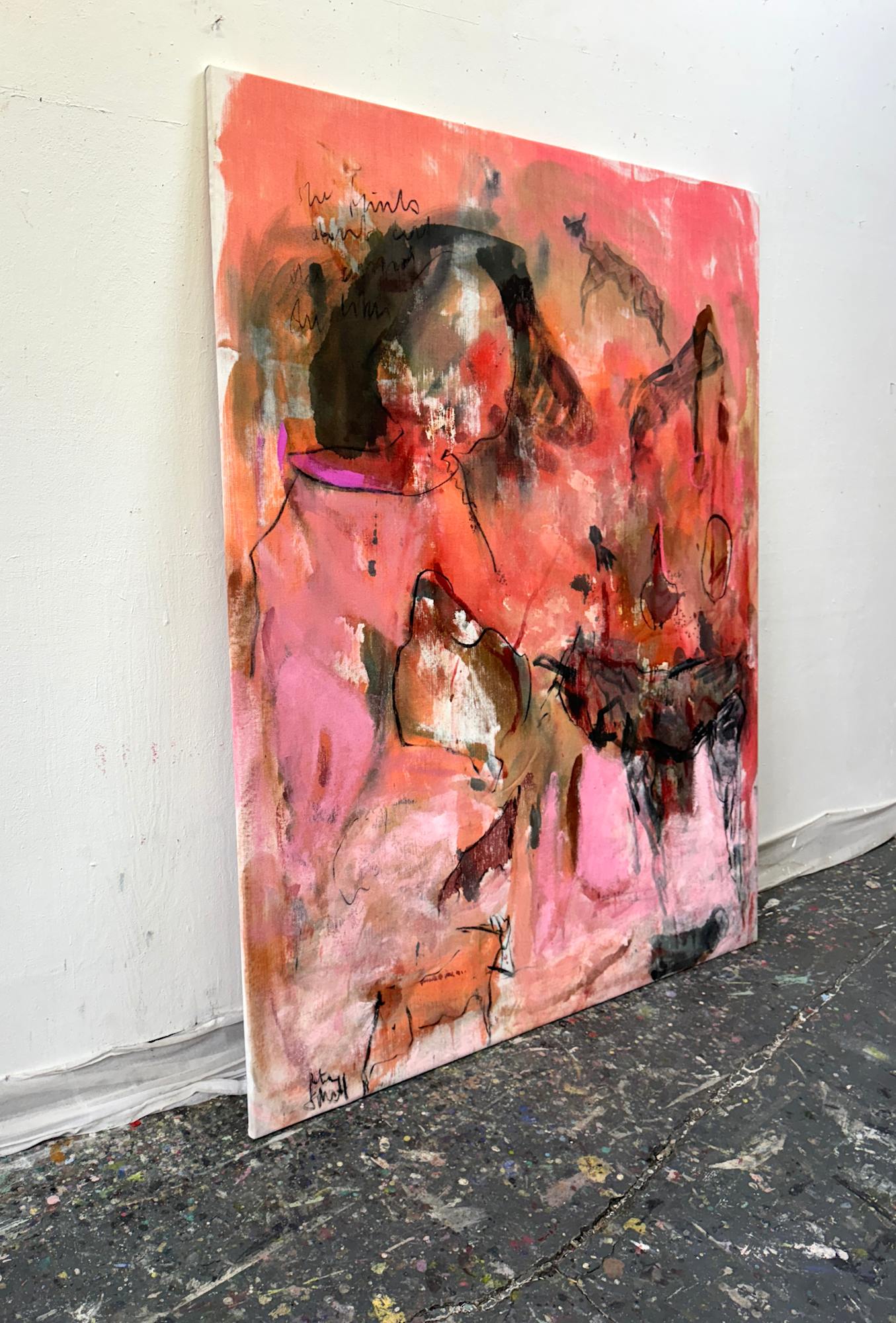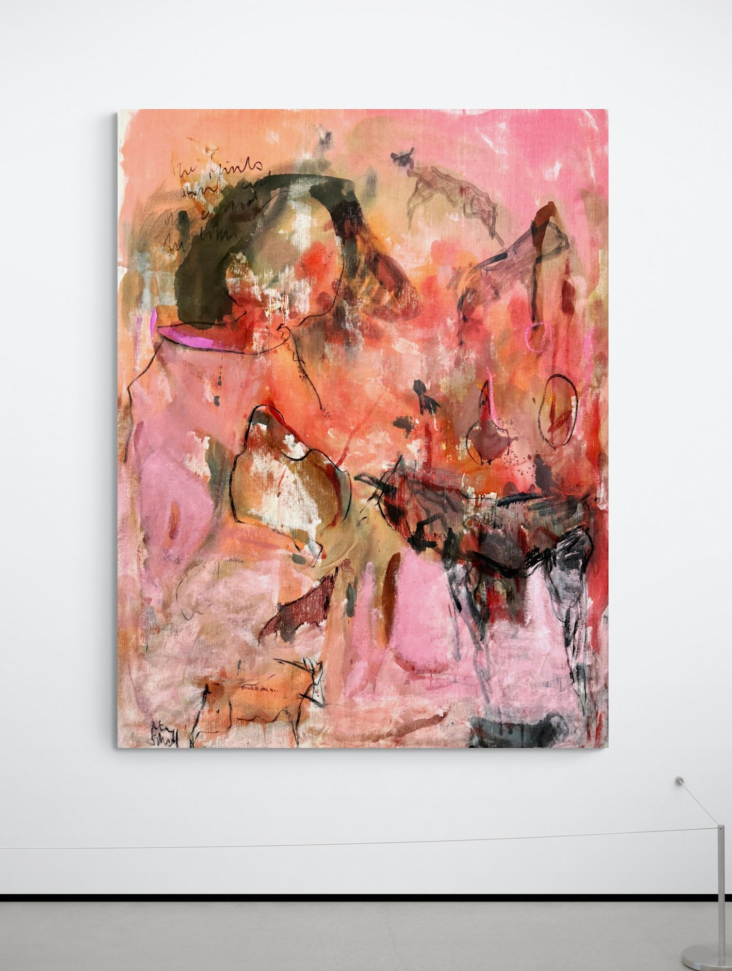 This large-scale painting transports us into a dreamlike, ethereal world steeped in femininity and connection. At its heart, we see a central female figure, serene and enigmatic, surrounded by a swirling ensemble of smaller figures and animals that seem to dance around her in an otherworldly rhythm. The composition exudes a sense of movement and harmony, as if the figures and creatures are part of a shared, sacred choreography.