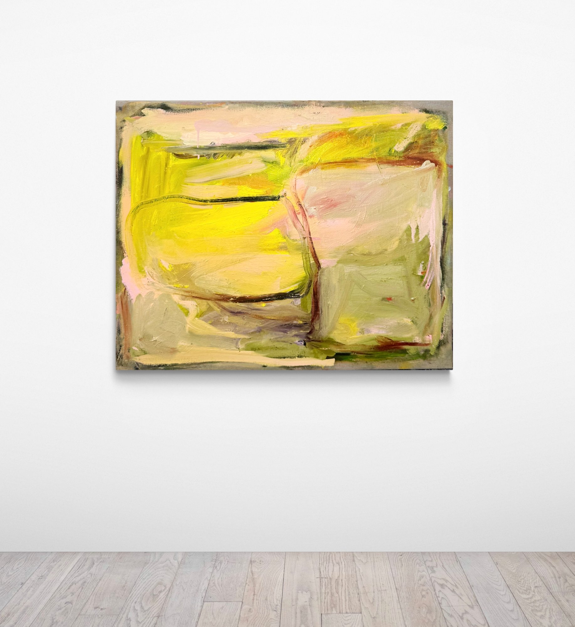 This work, with its warm shades of pink and yellow, radiates a sense of calm and confidence. It conveys a feeling of being in the right place. The title 'On My Way' reflects this confidence — the sense of being on the right path.