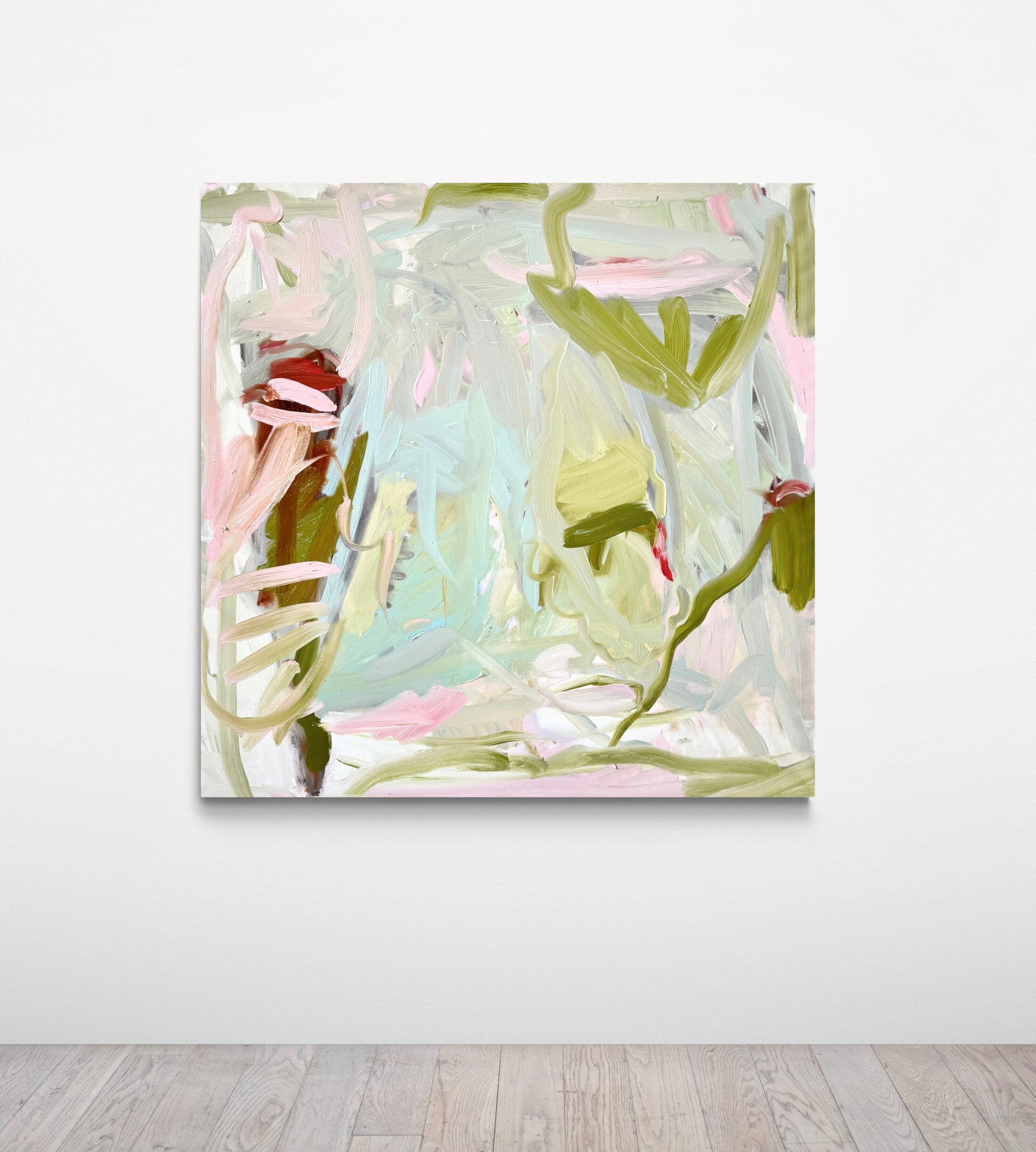 In this series, impressions and memories from summery gardens are processed in a painterly way. This abstract painting with its light green-blue shapes and lines evokes memories of past summers and a bit of nostalgia. The painting exudes the warmth, lightness and ease of the season, with the oil paints enhancing the depth and naturalness of the colors.