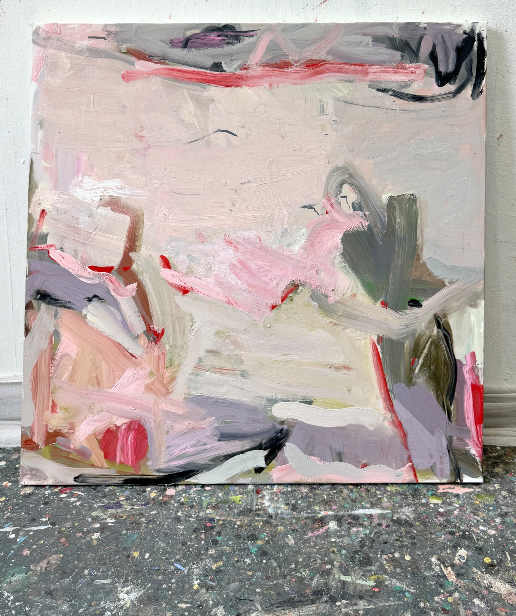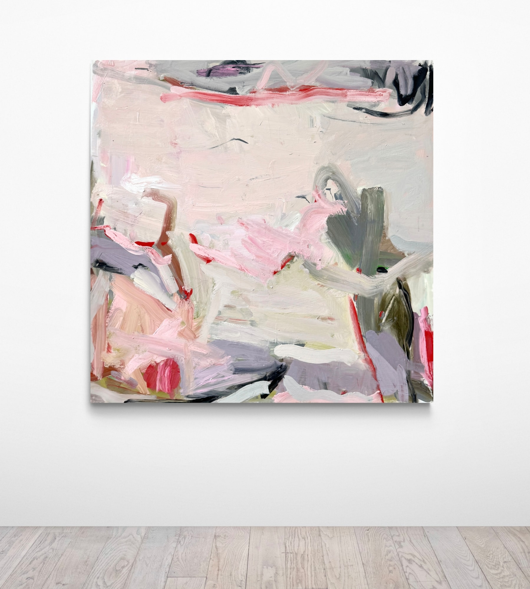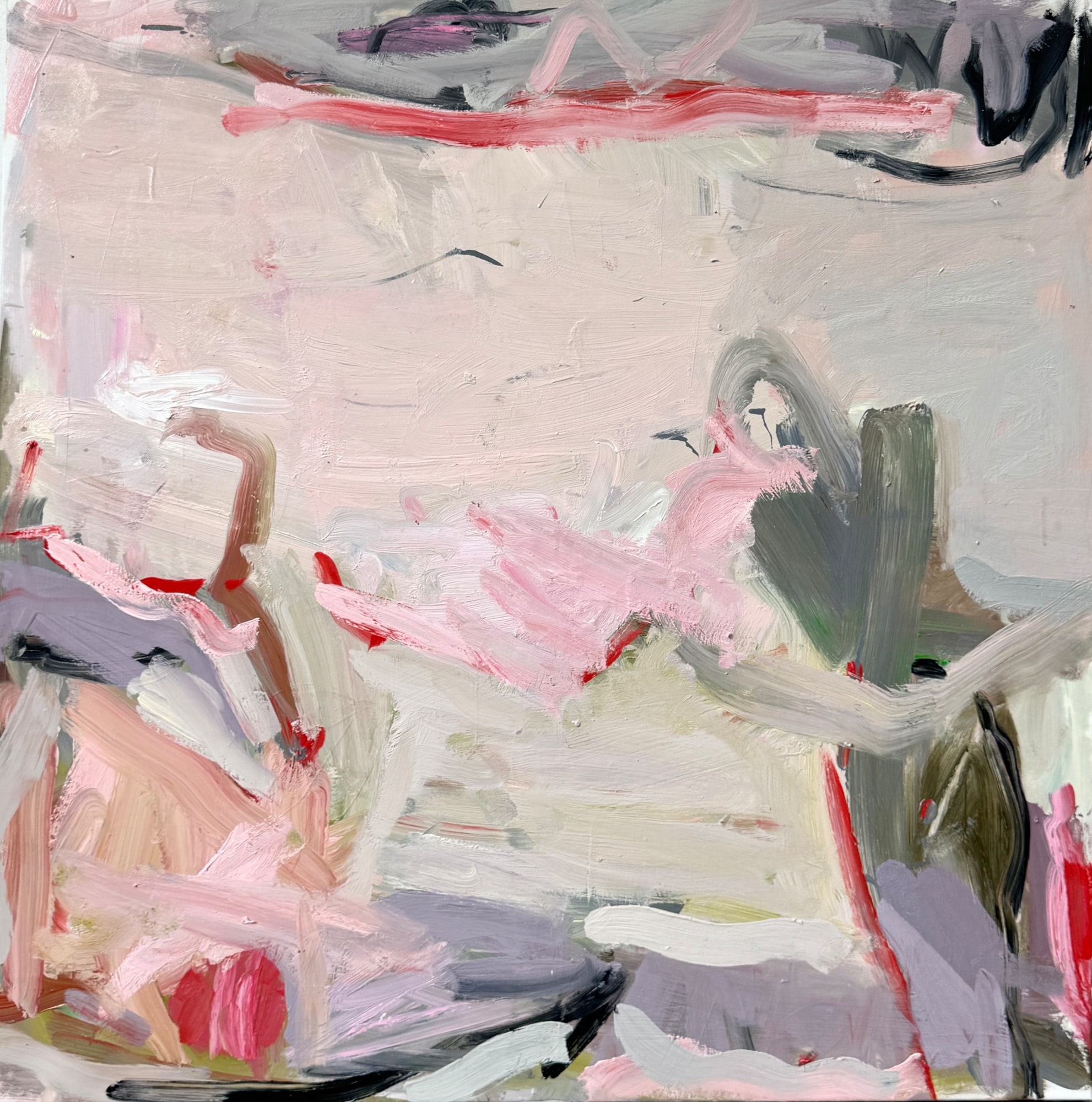 In this series, impressions and memories from summery gardens are processed in a painterly way. This abstract painting with its light rosé shapes and lines evokes memories of past summers at the coast and a bit of nostalgia. The painting exudes the warmth and ease of the season, with the oil paints enhancing the depth and naturalness of the colors.