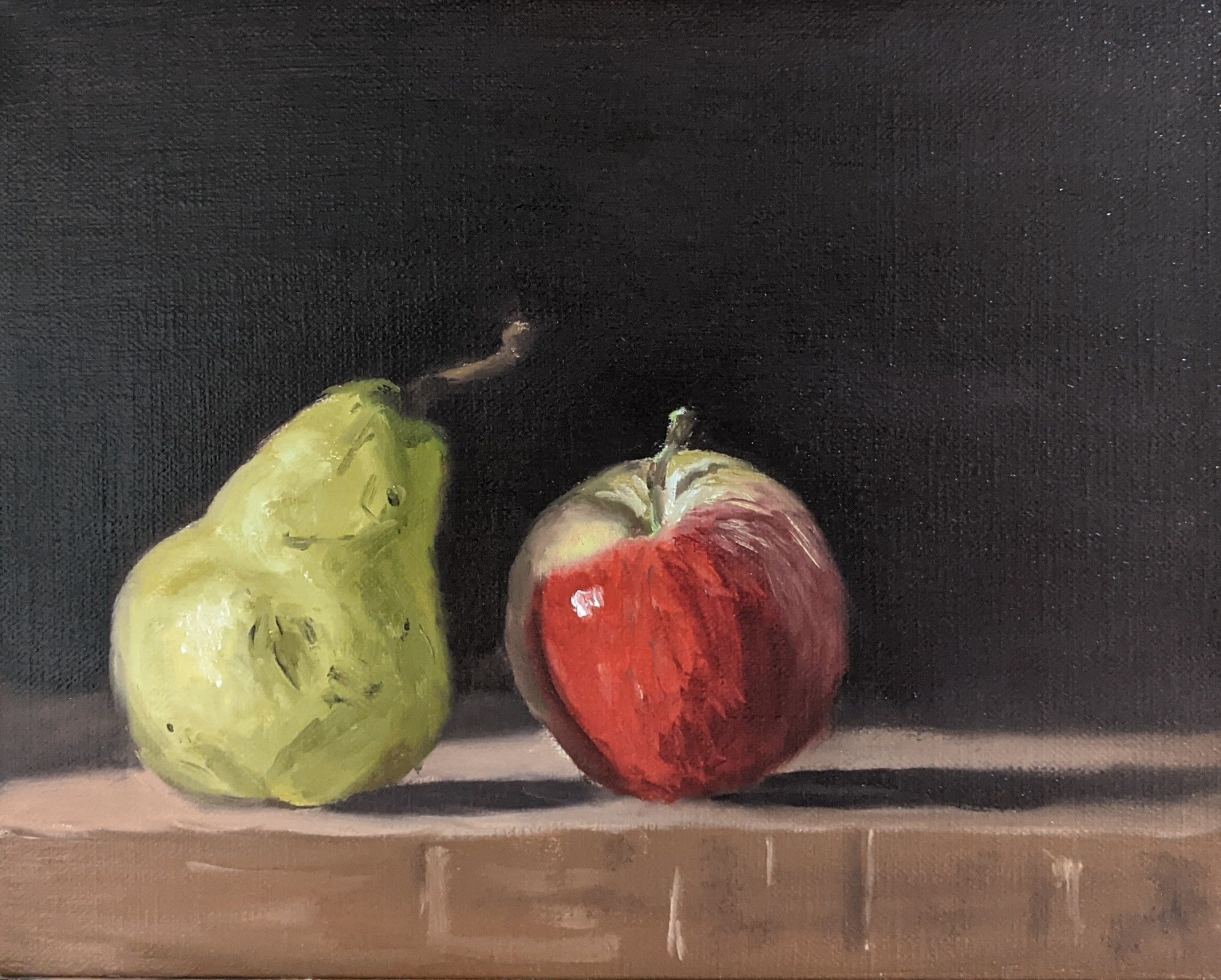 A commissioned alla prima painting of a pear and an apple in oil paint on linen