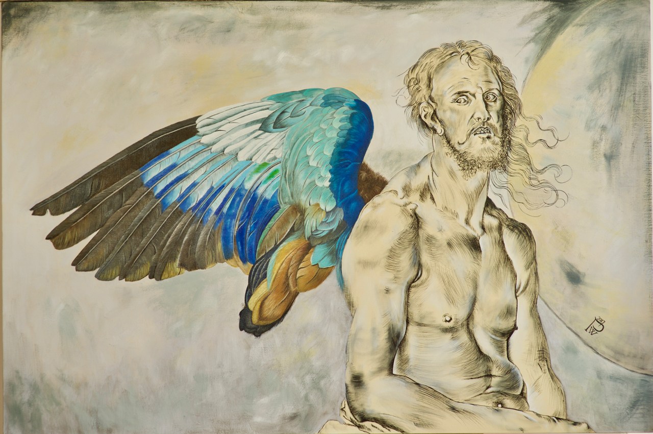 La combinaison de l'aile d'une étude d'oiseau magnifiquement colorée à l'Aquarelle de Albrecht Dürer et d'un autoportrait dans lequel Dürer se représente un peu comme un Christ en souffrance.