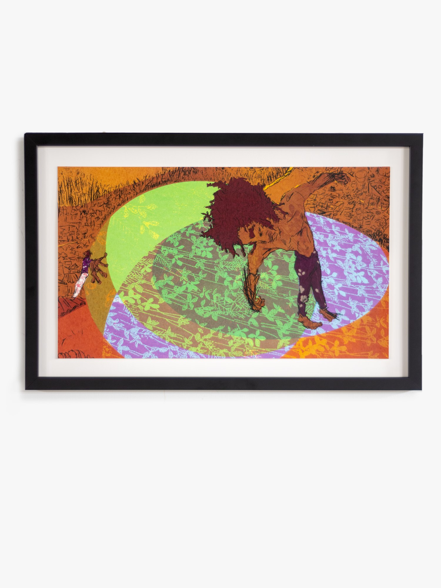 Jazzmen Lee-Johnson describes Grandma’s Lament as an “Afro-futurist sci-fi graphic novel that chronicles a present-day dystopia, an underwater past, and an astrological plastic future.” The series collapses multiple timelines to tell the story of a West African family. In one timeline, the family is kidnapped from West Africa into the atrocities of the trans-Atlantic slavery. Lee-Johnson depicts this period by alluding to Rembrandt’s The Three Crosses print from 1653. In the elder artist’s work, the subject is Jesus Christ on the cross, flanked by the two thieves who were crucified with him, and the Virgin Mary, mother of Jesus, weeping and supported by the Evangelist. A mass of Roman soldiers on horseback, along with grieving citizens, surround the crosses. A beam of light, representing God's light from heaven, pierces the darkened sky to envelope the crucified figure of Christ. Rembrandt’s frenzied cross-hatching and a shadow threaten to engulf a whole scene of the figures. This visual treatment transforms the scene from an image of pathos and sacrifice to one of darkness, doubt, and chaos. Lee-Johnson uses similar cross-hatching and shadow techniques to depict the violence and tragedy inflicted upon the family and other Africans by slave-traders. The second timeline shown in Grandma’s Lament, however, features a spotlight effect reminiscent of the light from heaven shown in The Three Crosses. Corollary images with beams of light show the family’s joy and bliss amidst a life in their native lands uninterrupted by the horrors of colonialism.