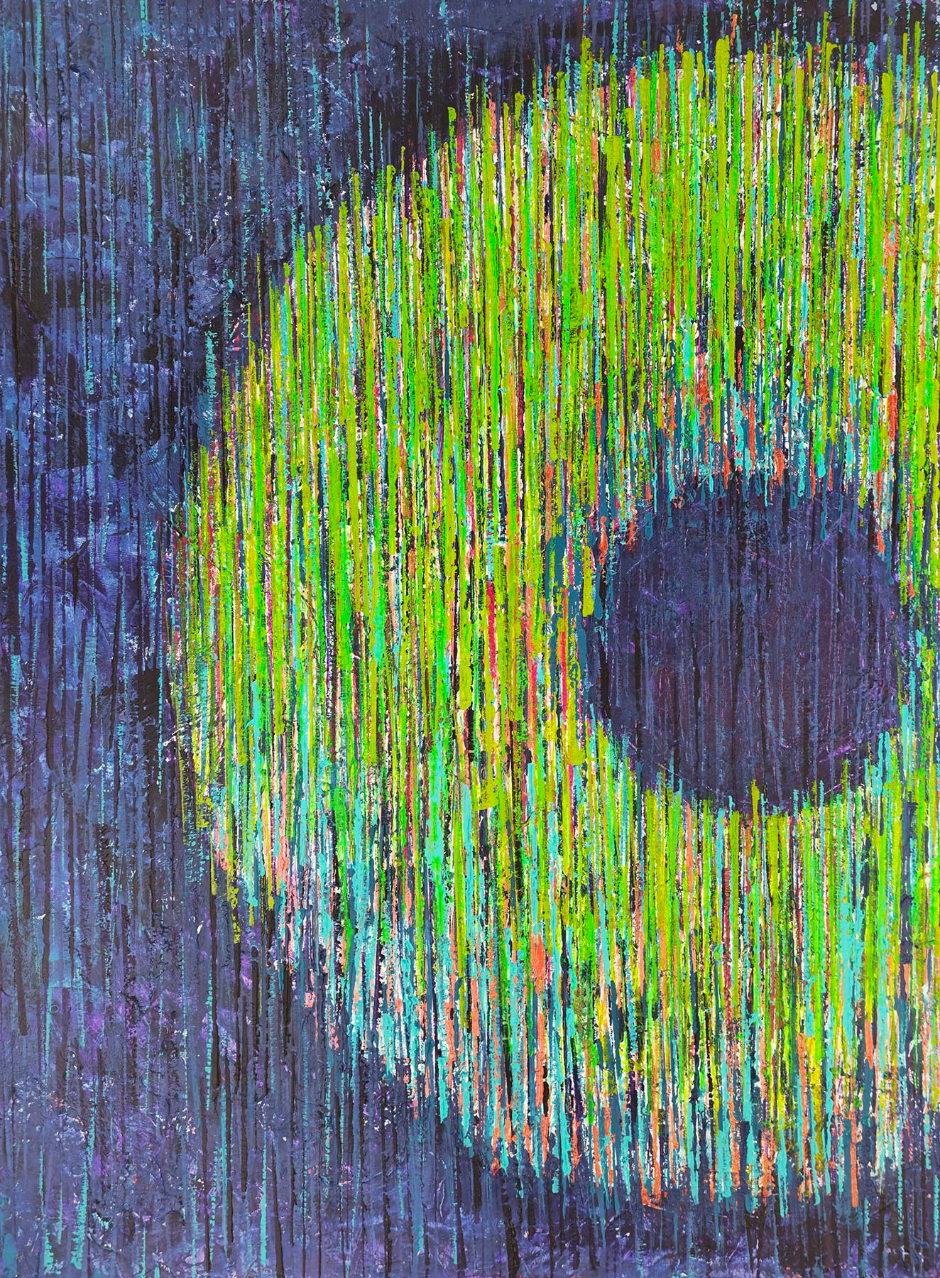 It was inspired by a lighting effect at a Phish concert in which stage lights were projected in a donut pattern onto a falling “curtain” of sand that was being dropped from the rafters. It created these stunning, shimmering donuts that looked like they were made of threads of shifting light. The image stuck with me, and I returned to it in my mind’s eye, over and over until I decided to try and paint it.