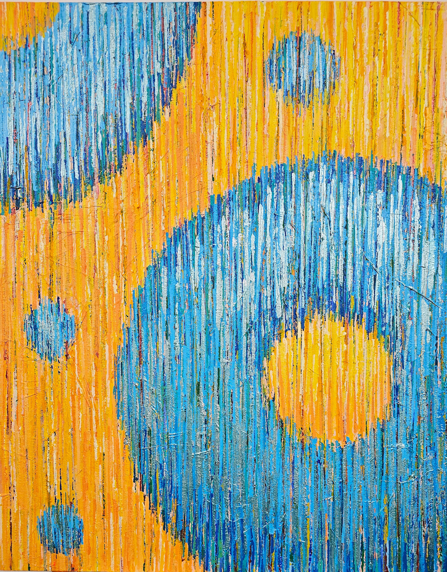 The paintings in the "Echoes of Illumination" series depict threads of shimmering light streaming into circular forms. Seen from afar, they are a graphic pop of color bringing joyful energy into the space, they catch the light and nearly glow. While the highly layered technique draws the viewer in, to look up-close and examine the tapestry of layers upon layers of many-colored vertical lines.