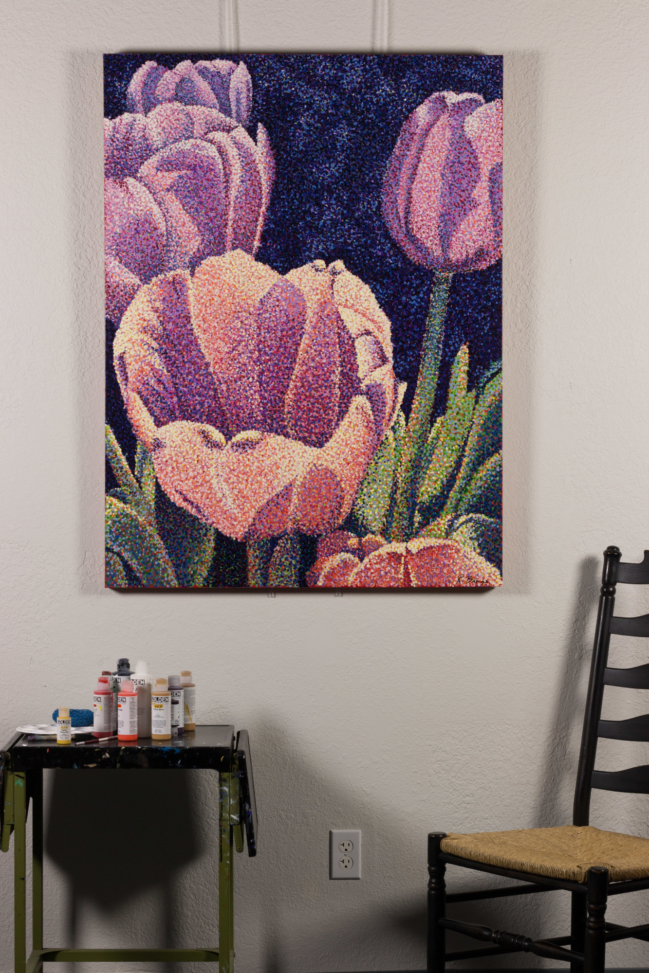 This tulip painting titled "In the Garden with Friends" was inspired by just that. A group of fiber artists joined together to visit Filoli Gardens. One of our number is a volunteer in the gardens and she was encouraging us to see all of the lovely tulips in bloom. It was my first time there and it was so gorgeous... and so fun to be wandering around with lovely companionship as well. It's also a lovely example of women supporting women.