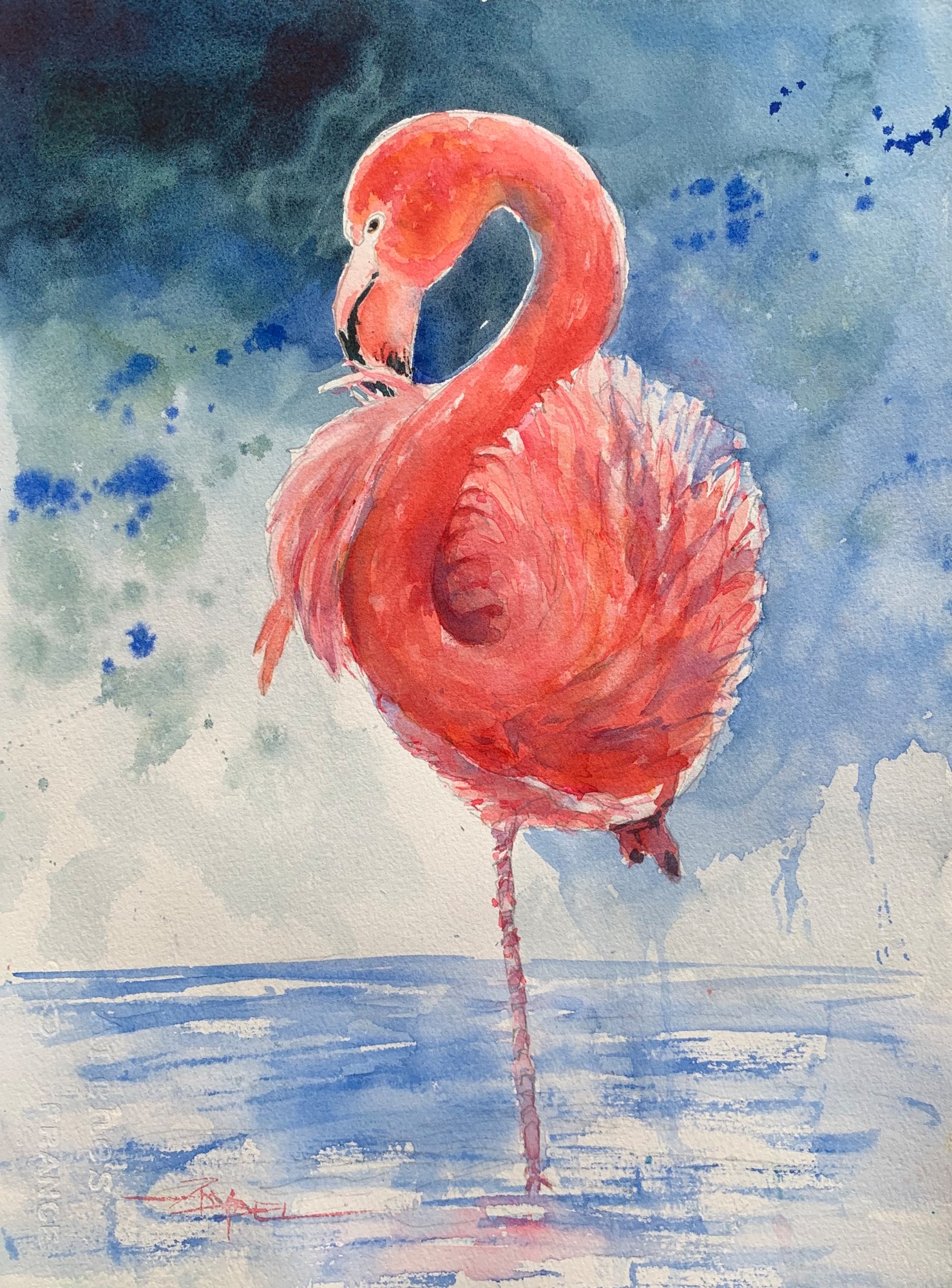 Flamingo in water with darkened sky