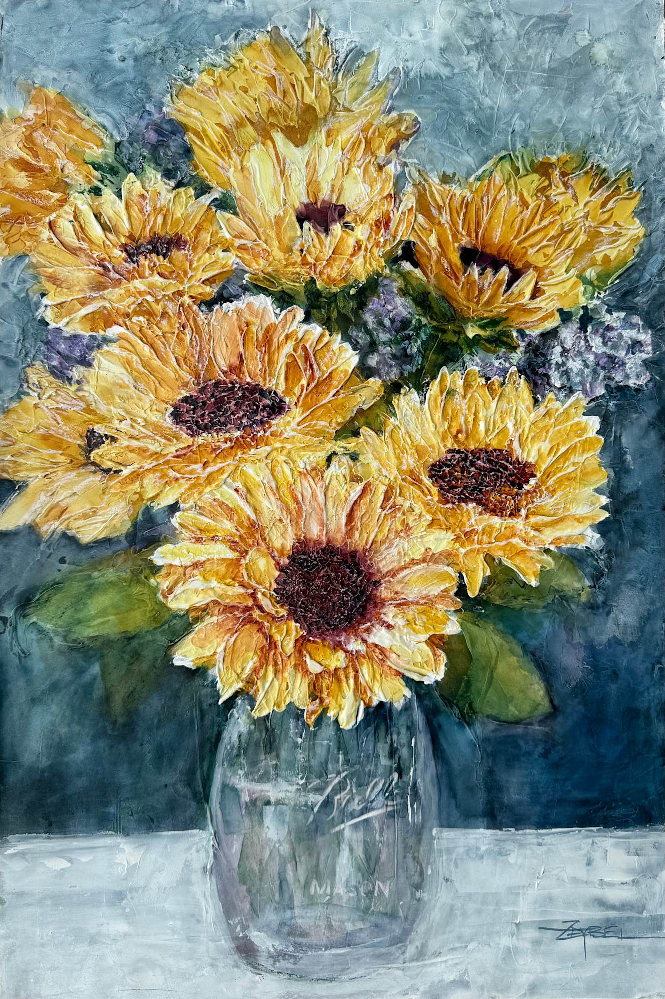 Highly textured surface drawing upon my love for Van Gogh's sunflowers