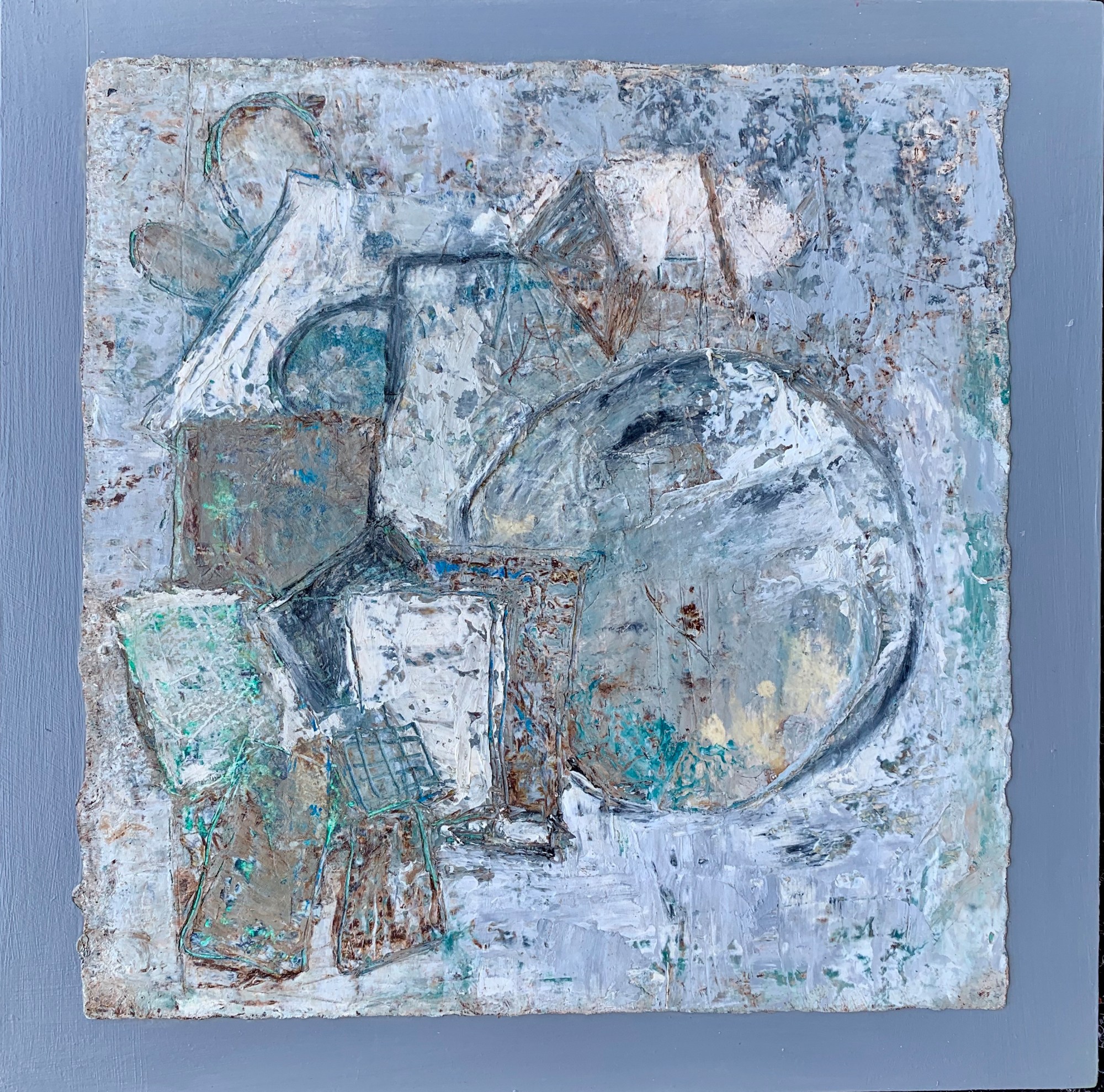 Interlocking geometric shapes in shades of gray, cream and teal