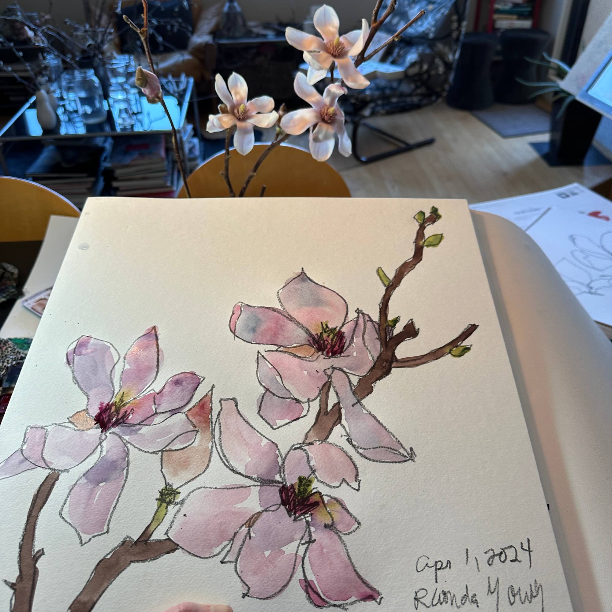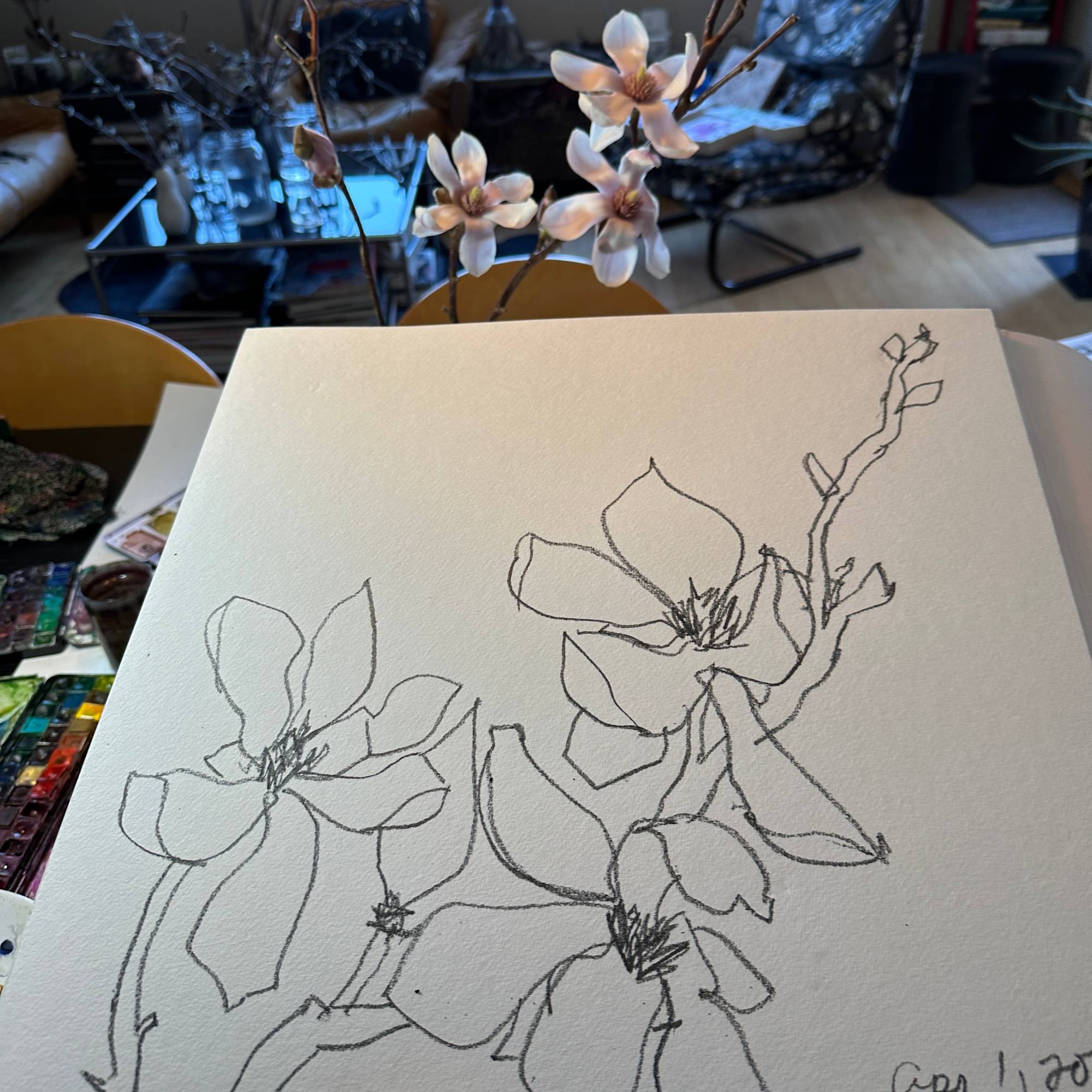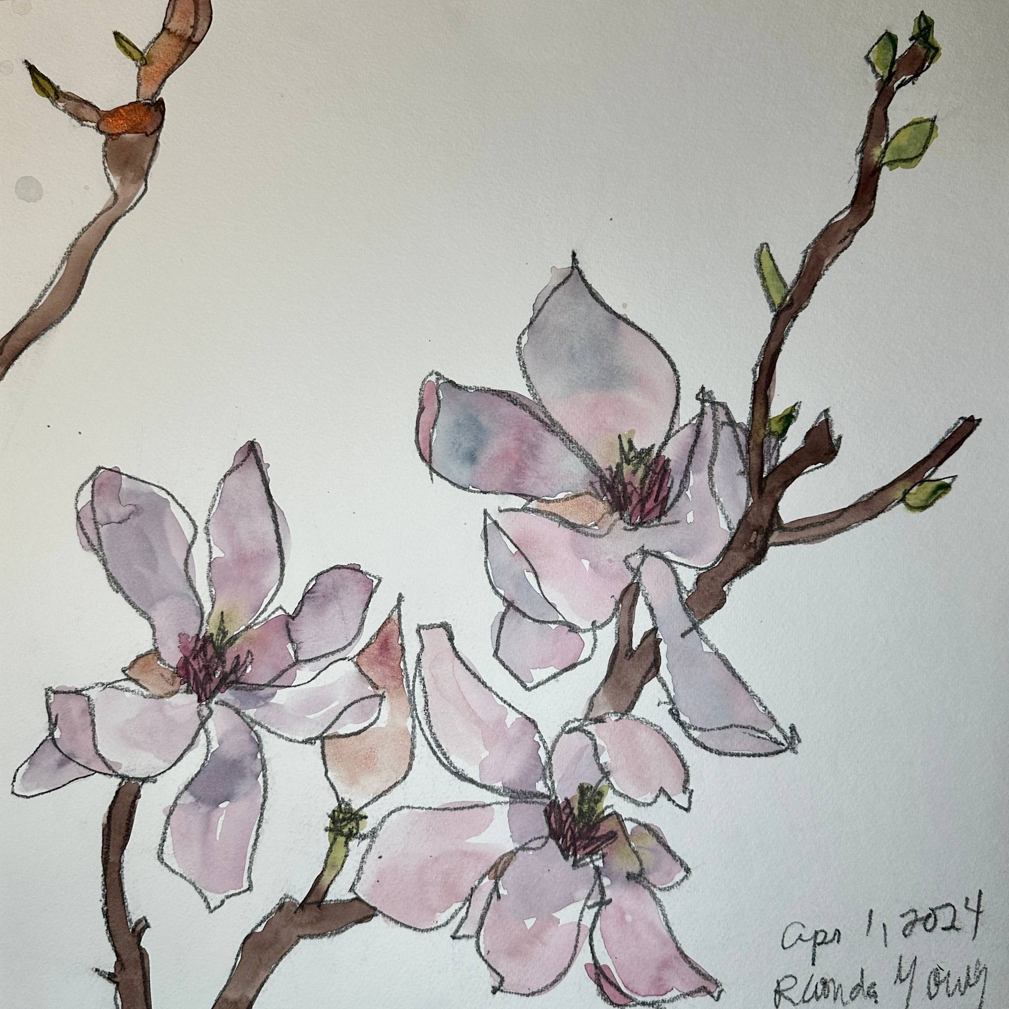 Observation from life of magnolia branch. Graphite and watercolour on cold press watercolour paper.