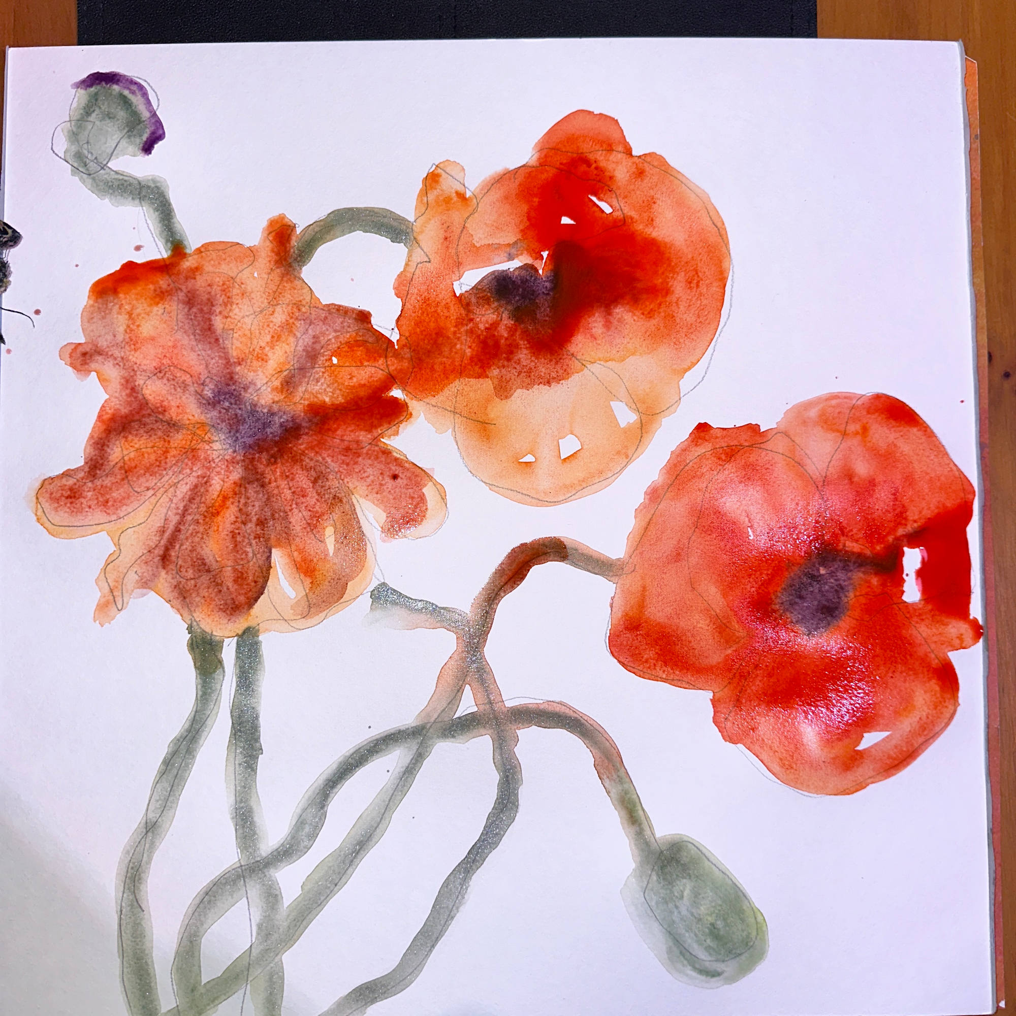 Observation from life in graphite and watercolour of poppies which come up every year between the sidewalk and foundation of my parents' house. I love the way they grow.