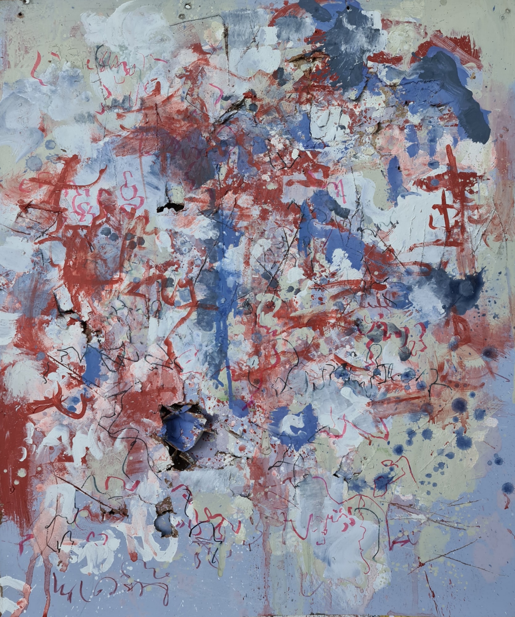 The title to this piece is place on its providence - it is intended to be a calming "aesthetic" work, but is made from half a door from a demolition site which had holes punched into it - evidence of crime or domestic violence.