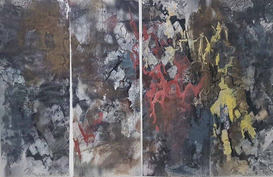 This large four paneled work involves reworked aerial images that are scratched and modified to create abstract shapes and forms. These are then over painted with oil and oxides. The resulting image is abstract but with memory and movement that gave rise to the title.