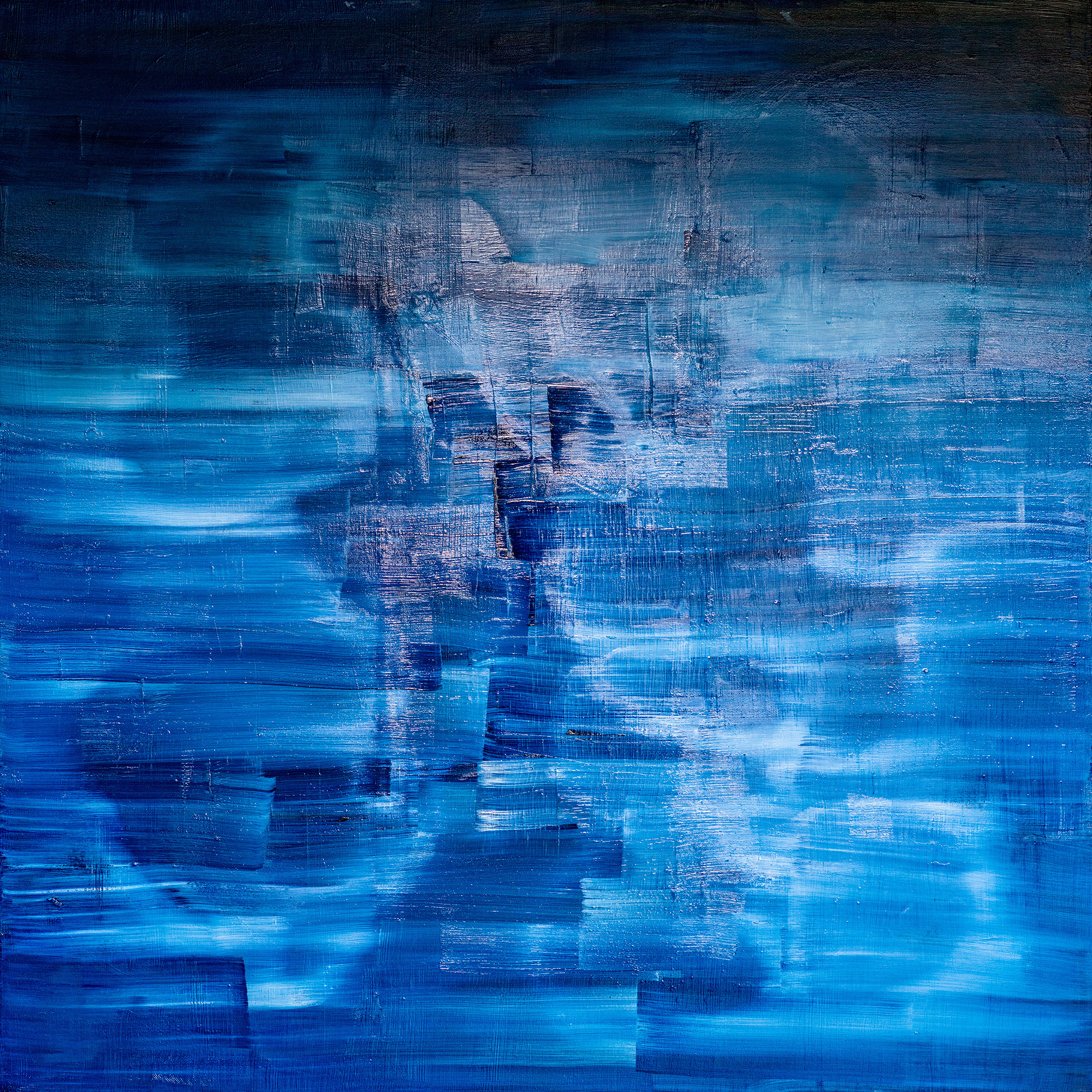 Submerged Structures lives entirely in blue — but blue as a world, not a color. From the near-black of the upper depths to the electric cyan of the lower field, the painting moves through every register of water and atmosphere, light and shadow, surface and what lies beneath it. At center, darker forms press upward through the layers — architectural, almost urban, caught between emergence and dissolution. Horizontal marks sweep across the lower half like current. The structures neither sink nor surface. They hold, suspended, in a field that is always in motion.