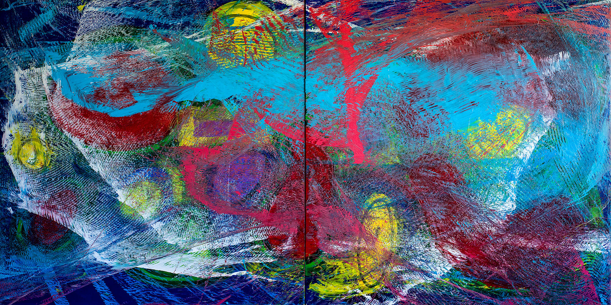 Tangled Pulse of a Shattered World is an expansive 9-foot diptych exploring fragmentation and vibration. Part of the Organic Movement, this work uses acrylics and retarder to allow Raj’s signature thread technique to drag pigment into layers of tension and unlikely harmony. Explosive electric reds and cobalt blues clash with bursts of turquoise, creating a rhythmic aftershock of upheaval. The diptych format provides a vital pause, suggesting that collapse is not silence, but motion. Ultimately, the piece rewires perception, transforming grief into a musical, architectural build of sensation—a reminder that even within a shattered world, a resilient heartbeat continues.