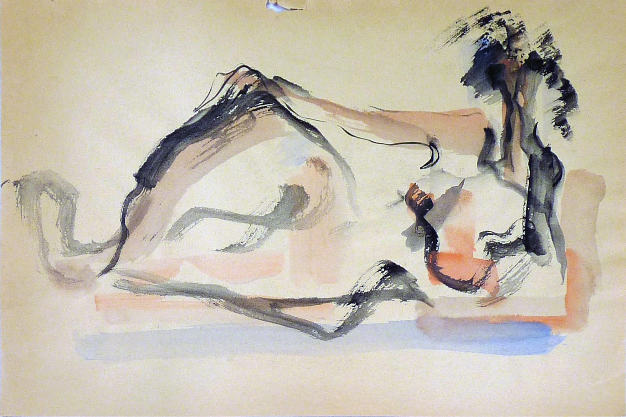 Gestural image of a reclining figure expressed in orange, blue, and black