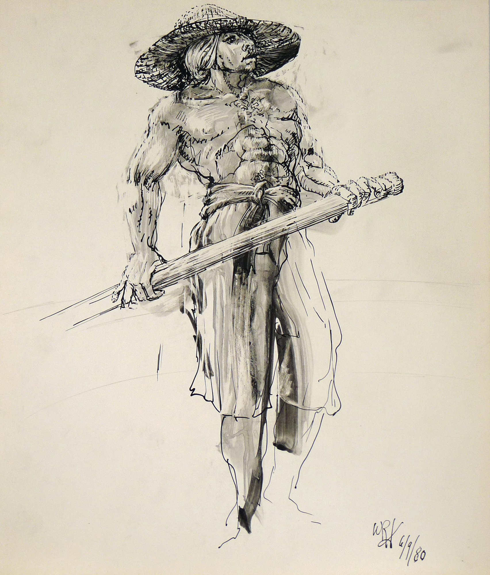 Image of a bare-chested man, wearing a conical bamboo hat, standing while rowing with an oar.
