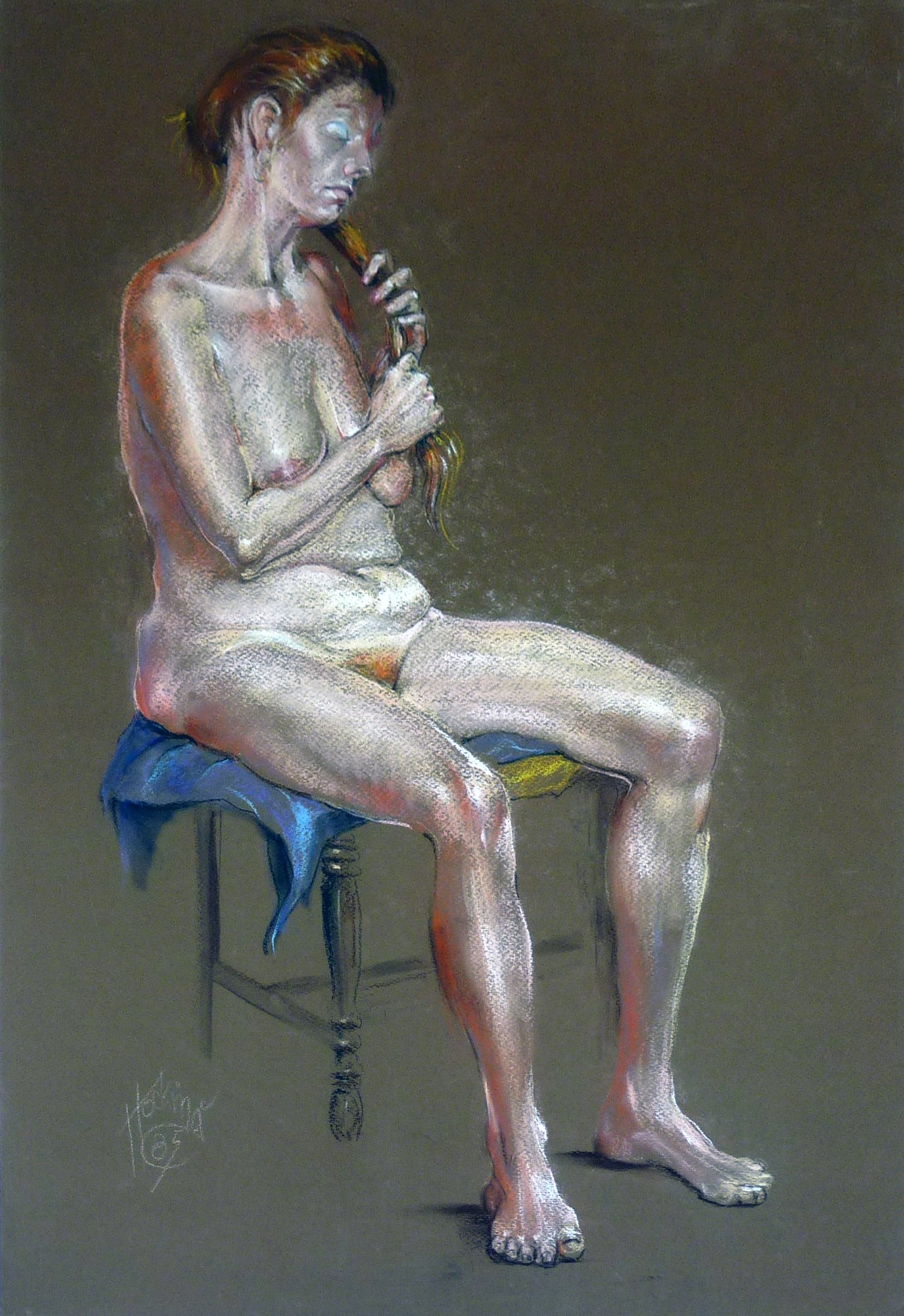 Image of a nude female figure with a long red ponytail, seated on a stool with a blue cushion