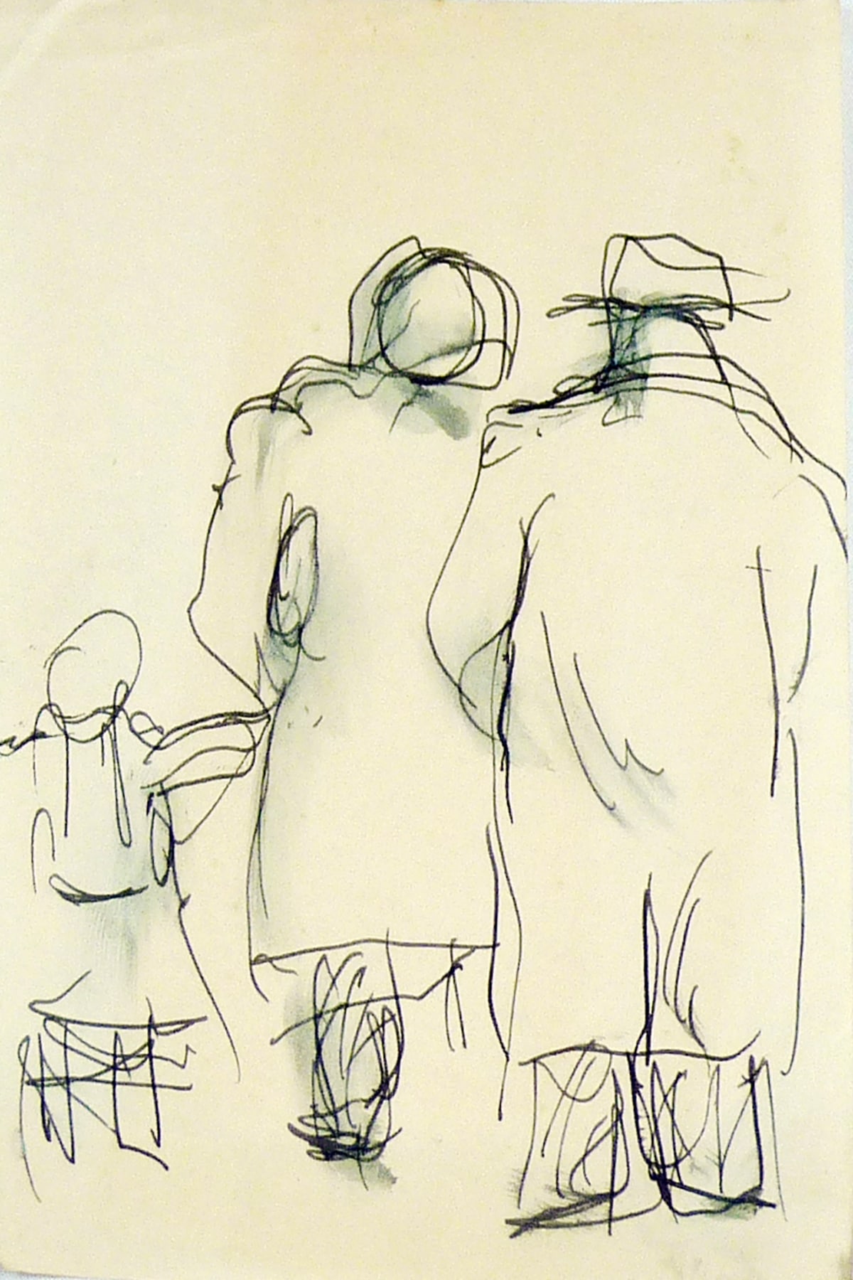 Back view of a man, woman, and child walking. All are wearing coats, the man is wearing a hat and the woman, a scarf