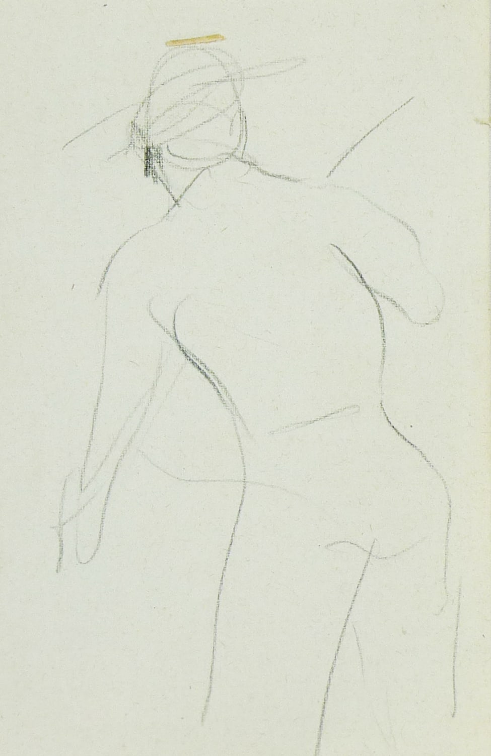 The front side is a back/side view of a person standing, leaning over. The back side is a side view of a person standing, leaning over